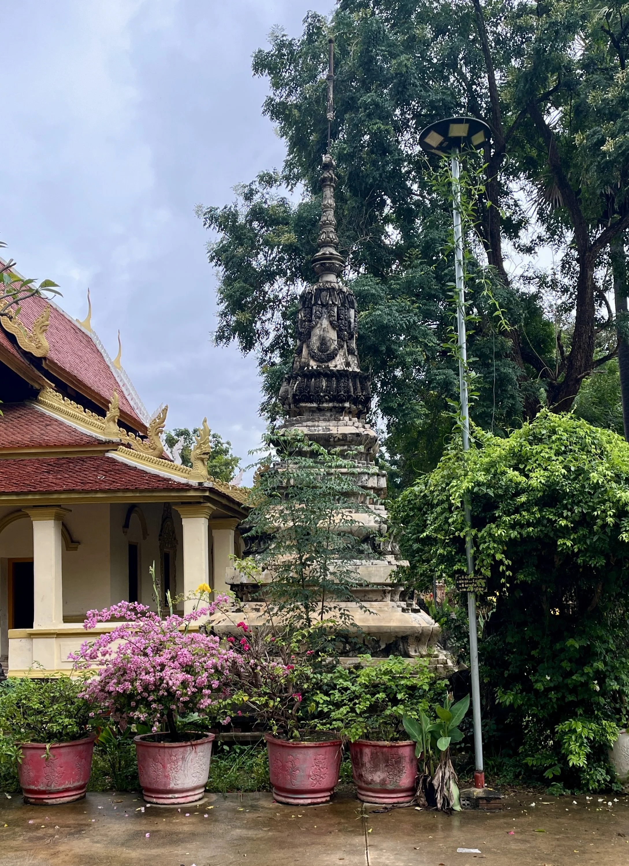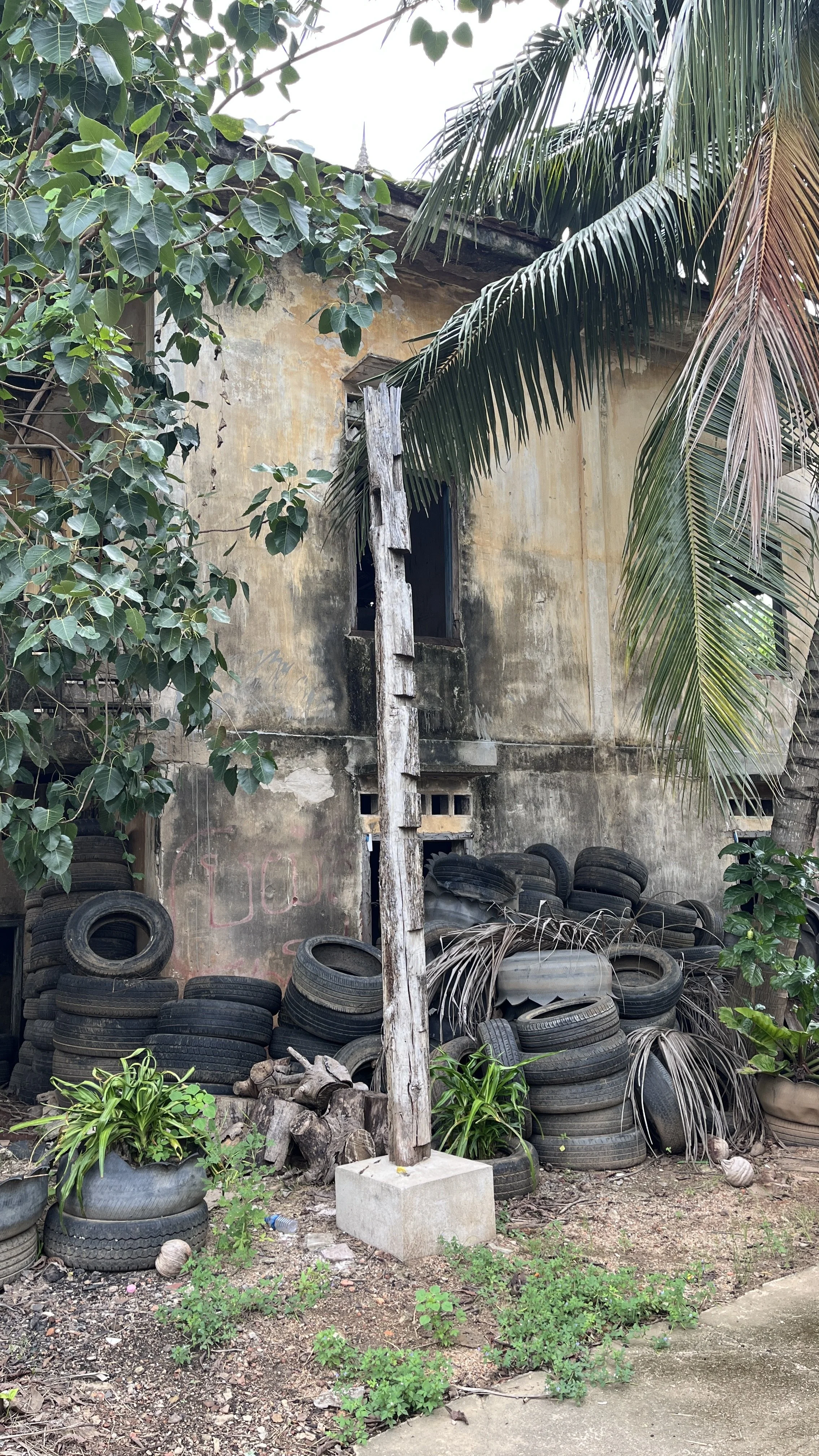 The entrance is via the downstairs burger restaurant. I initially didn’t quite realize it was a restaurant; not just because of the animals, but because there were no customers, and 2 tables and the bar/counter were covered with the owner’s dusty random shit (motorcycle helmet, cigarette packs, piles of papers, etc.) I only learned today when checking the address for this post (and going down the obligatory google maps reviews rabbithole) that the owner is considered a minor celebrity in Cambodia, a Frenchman who has totally gone native and has 3.2 million tiktok followers making Khmer language shorts. Perhaps this house is his home base when he’s not traveling, and the restaurant is more of a why not than a serious endeavor?