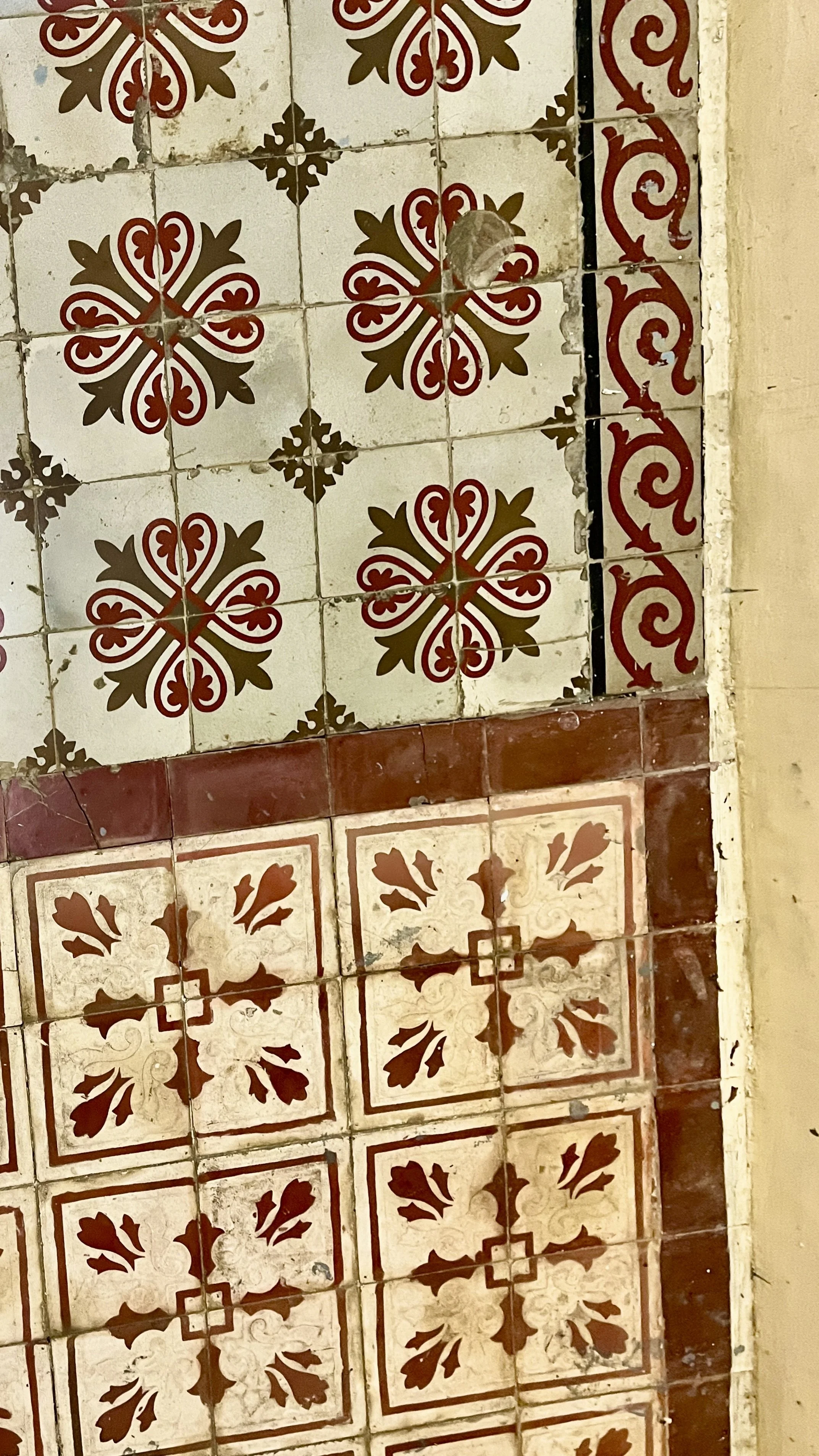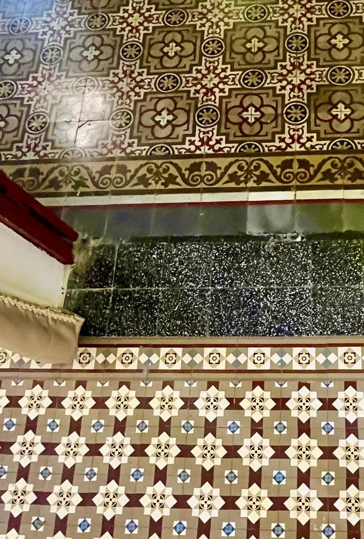Hard to tell if these are original tiles or not. I think mostly, but there is a huge jumble in this building. The pretentious polyester curtains really bring out the depression of it all.