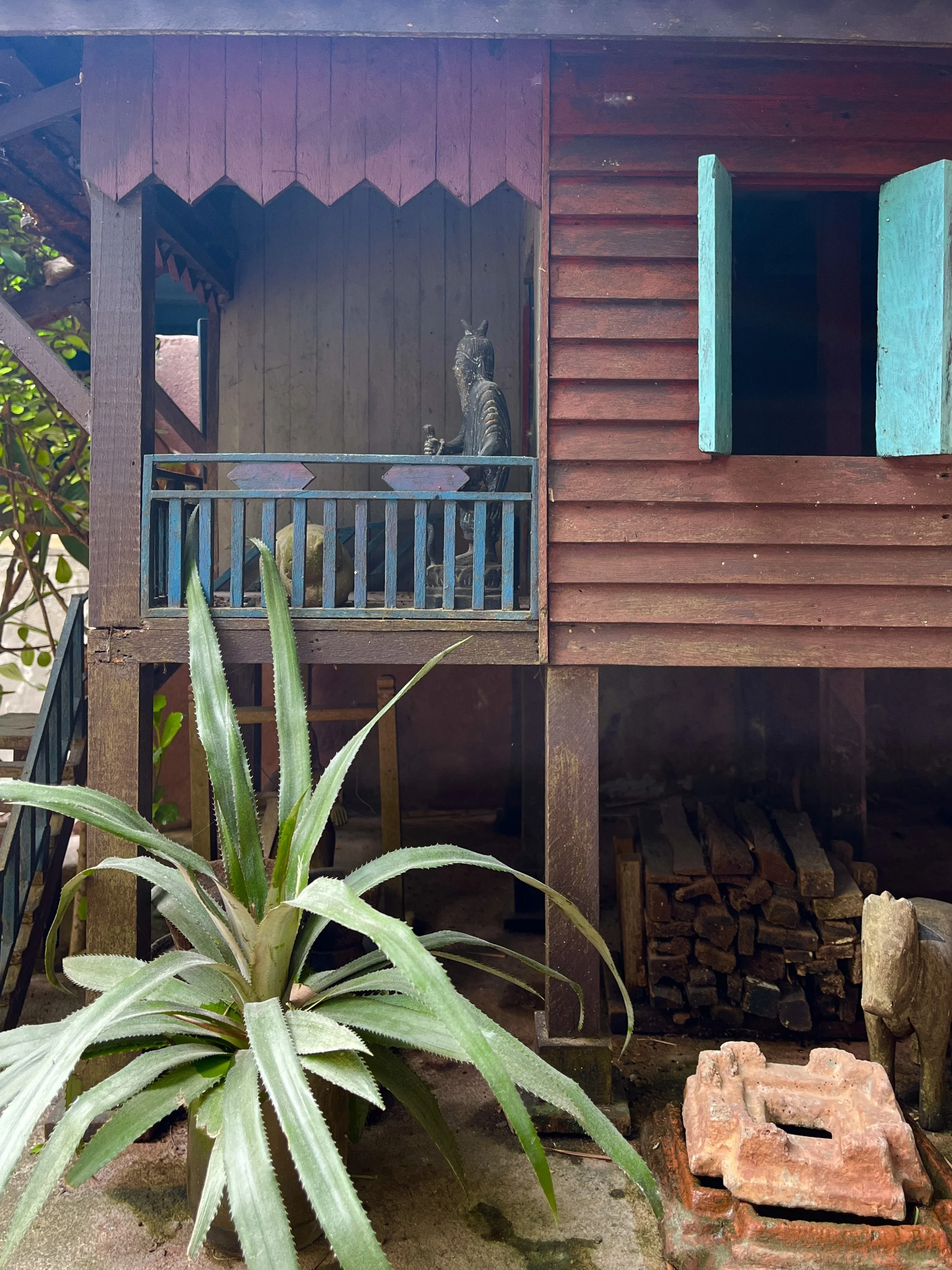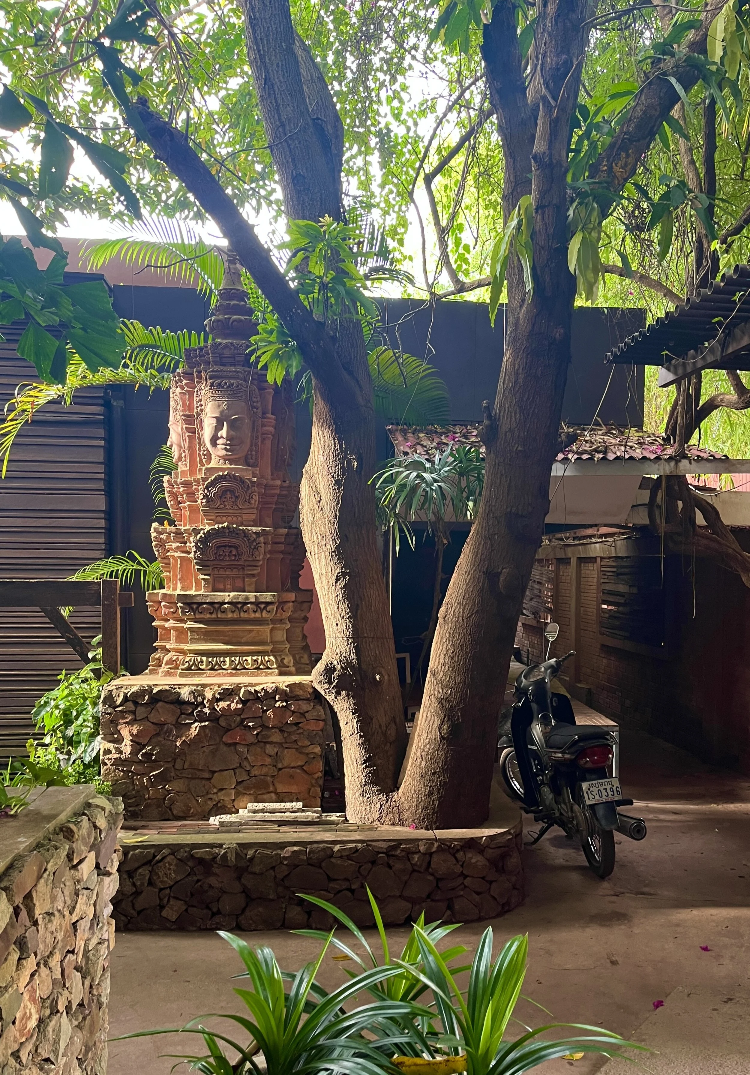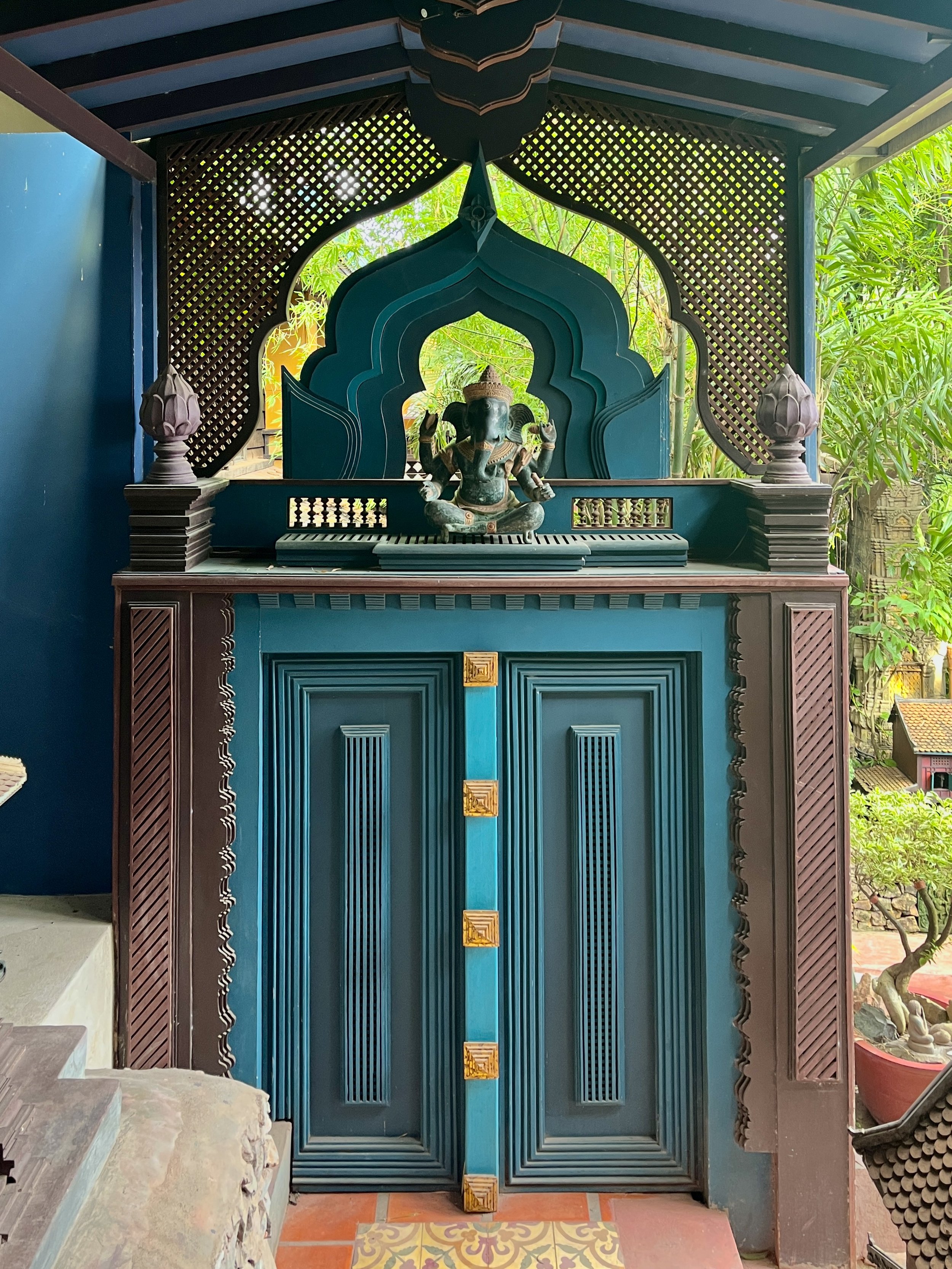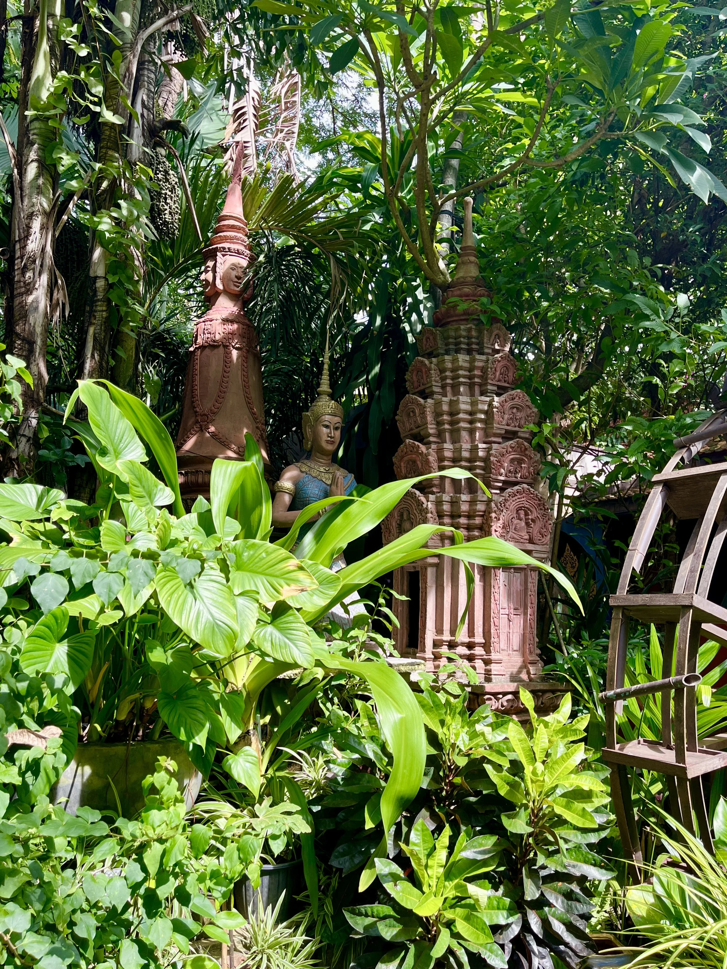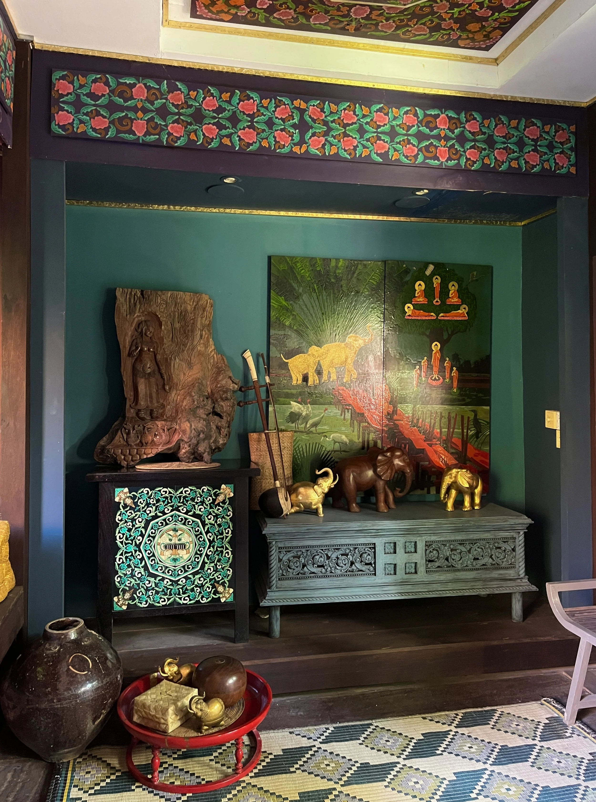 The place is a series of architectural and decorative arts vignettes, composed entirely of traditional crafts and motifs, studded with a few genuine antiques. The skill and taste level here is often mid, but occasionally striking, and rather more delightful when you understand and witness the place as a living document, an open workshop. Theam himself was on the premises when I visited, directing some roofing and repainting of a façade; he noticed me but did not introduce himself. In addition to the introduction to the language of Khmer aesthetics, the thing I appreciated most is his color sense- very different from mine, but I don’t dislike it. Dark chocolate woods and gemtone paints and fabrics figure heavily.