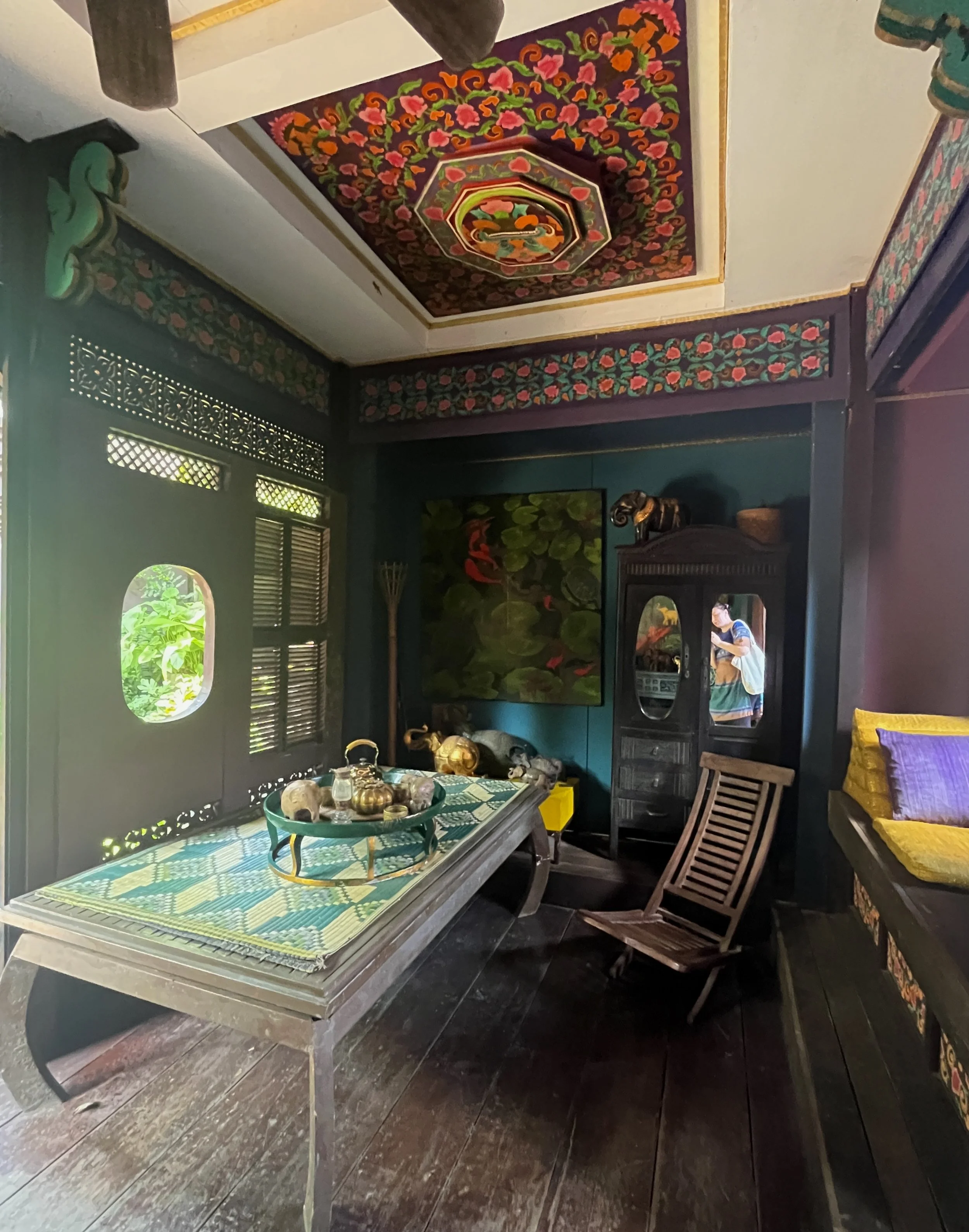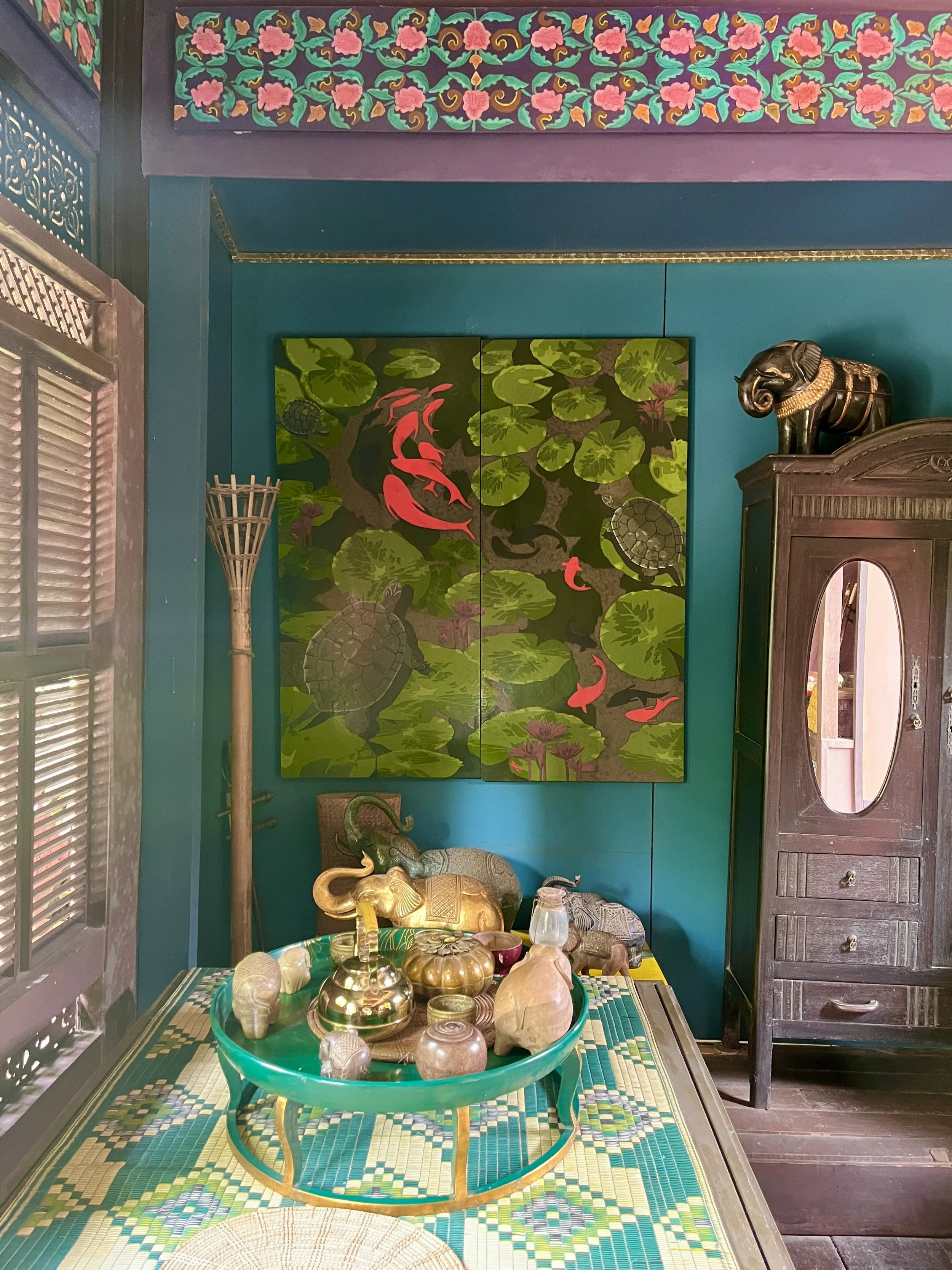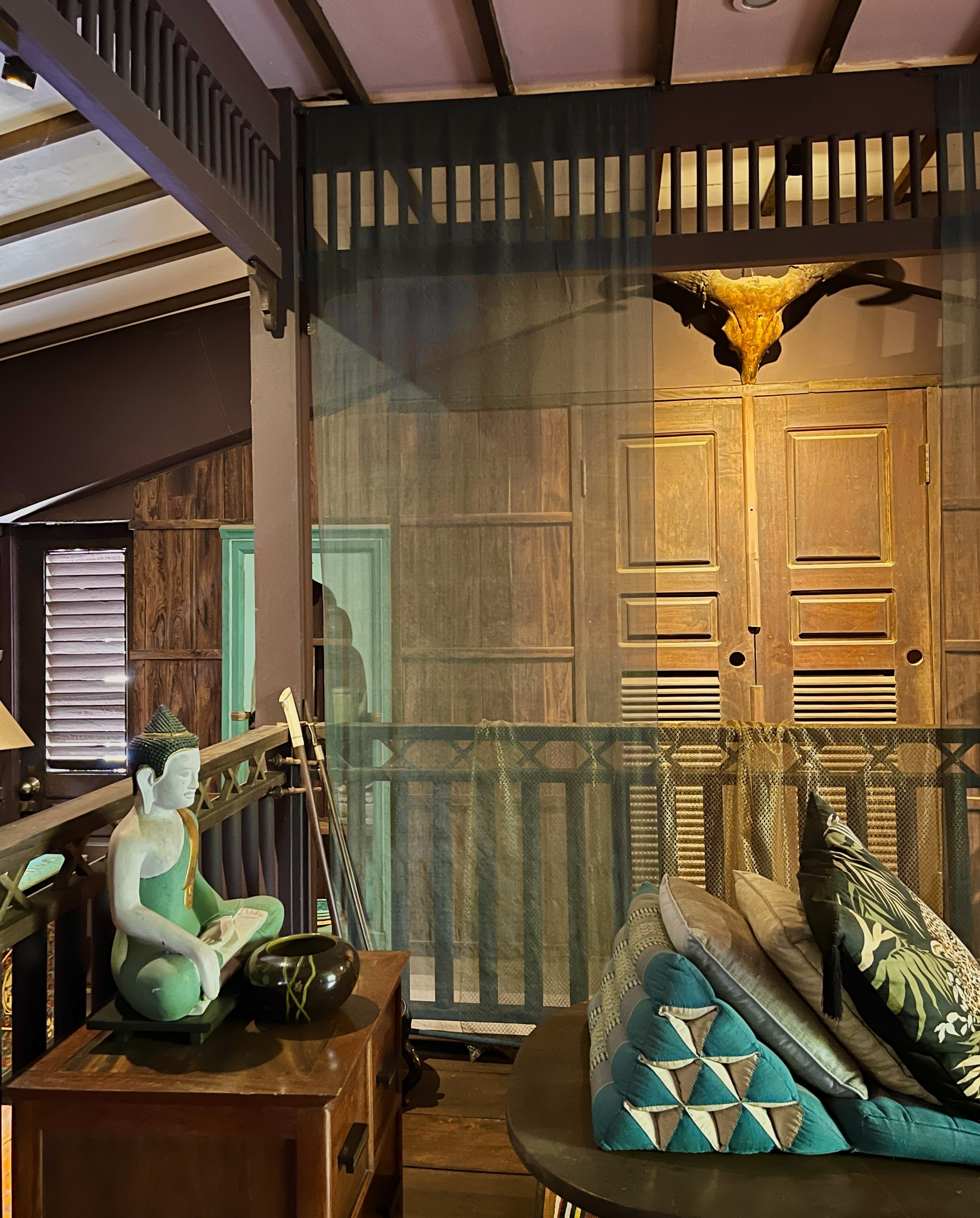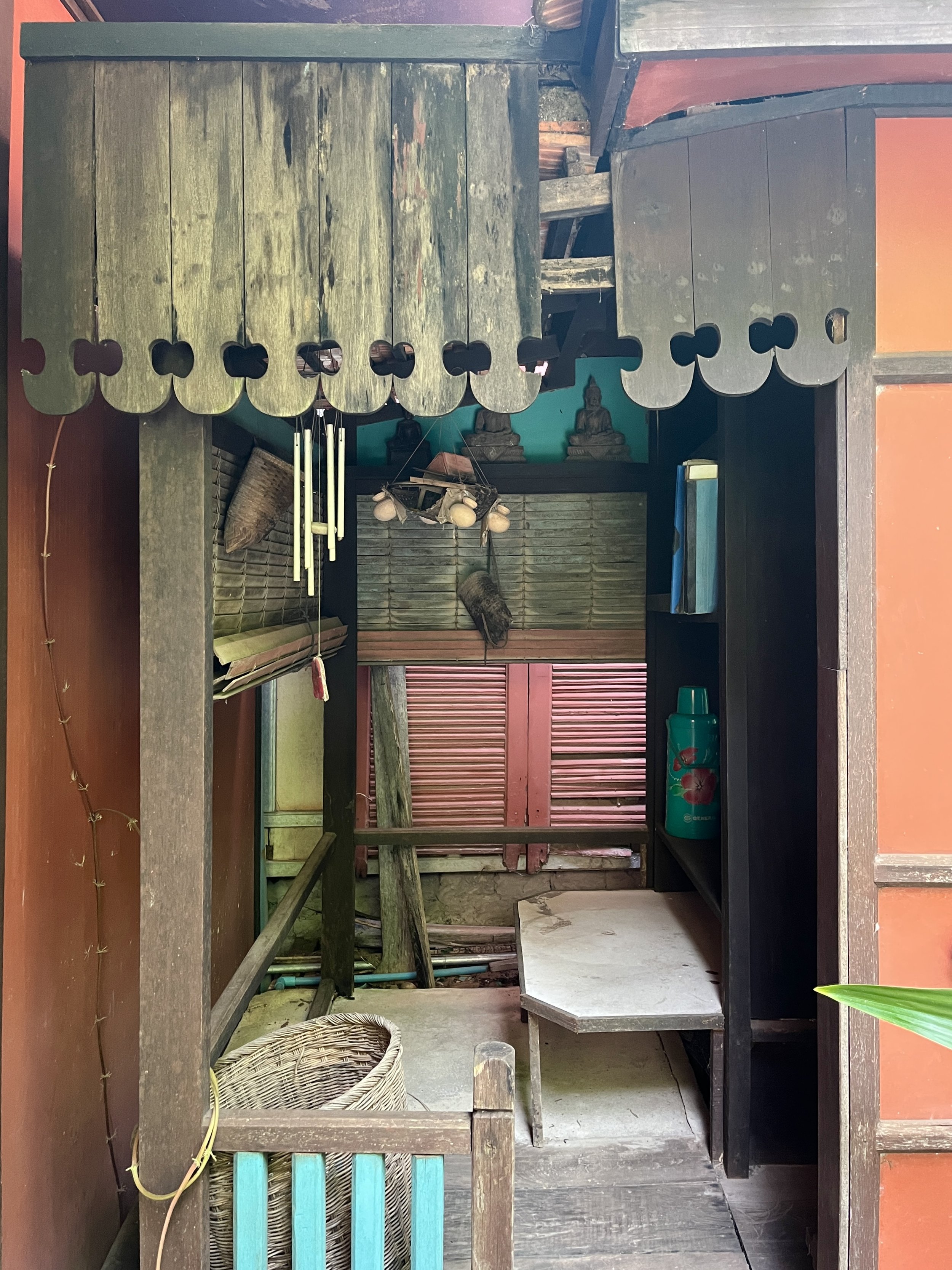 The place is a series of architectural and decorative arts vignettes, composed entirely of traditional crafts and motifs, studded with a few genuine antiques. The skill and taste level here is often mid, but occasionally striking, and rather more delightful when you understand and witness the place as a living document, an open workshop. Theam himself was on the premises when I visited, directing some roofing and repainting of a façade; he noticed me but did not introduce himself. In addition to the introduction to the language of Khmer aesthetics, the thing I appreciated most is his color sense- very different from mine, but I don’t dislike it. Dark chocolate woods and gemtone paints and fabrics figure heavily.