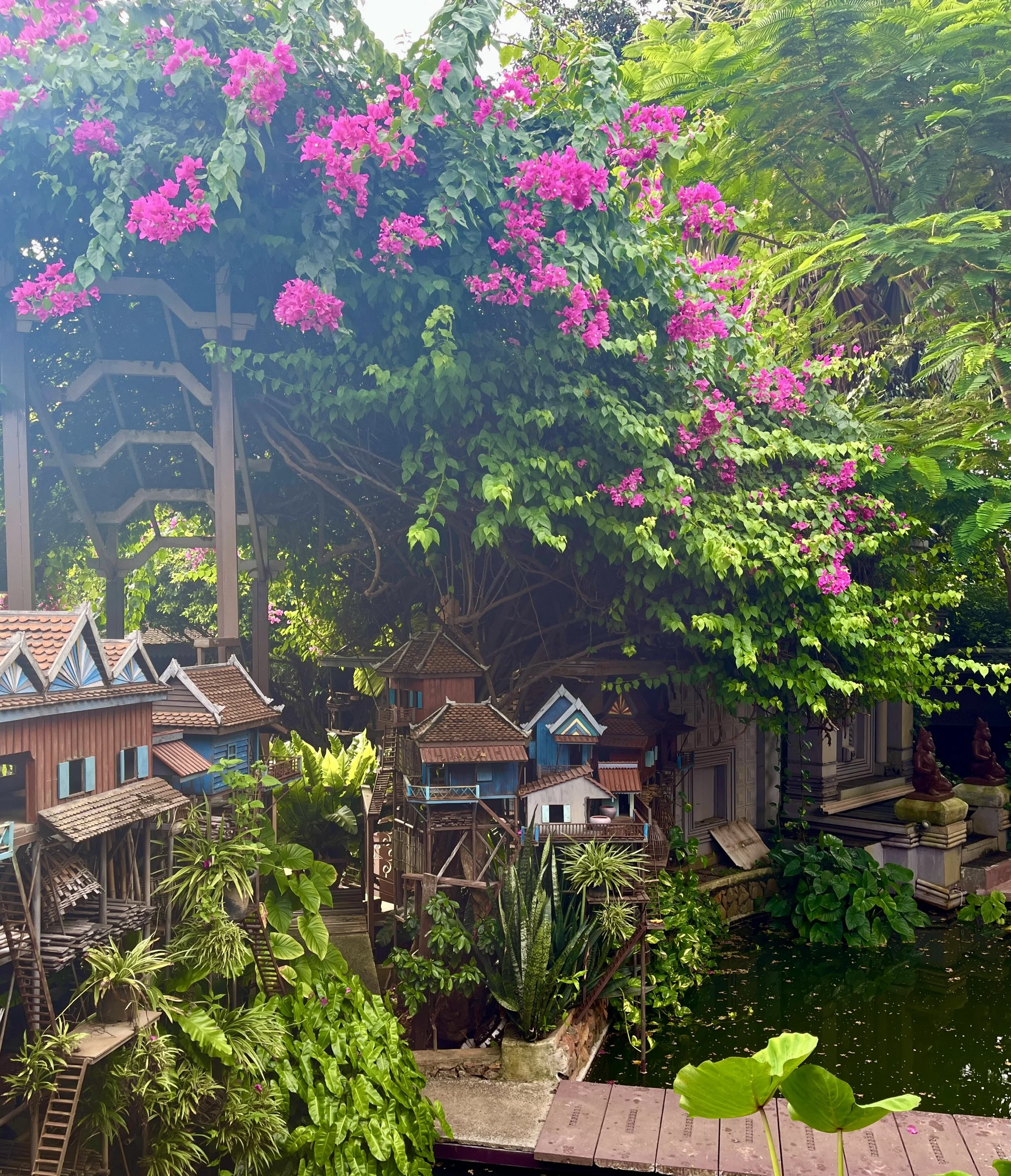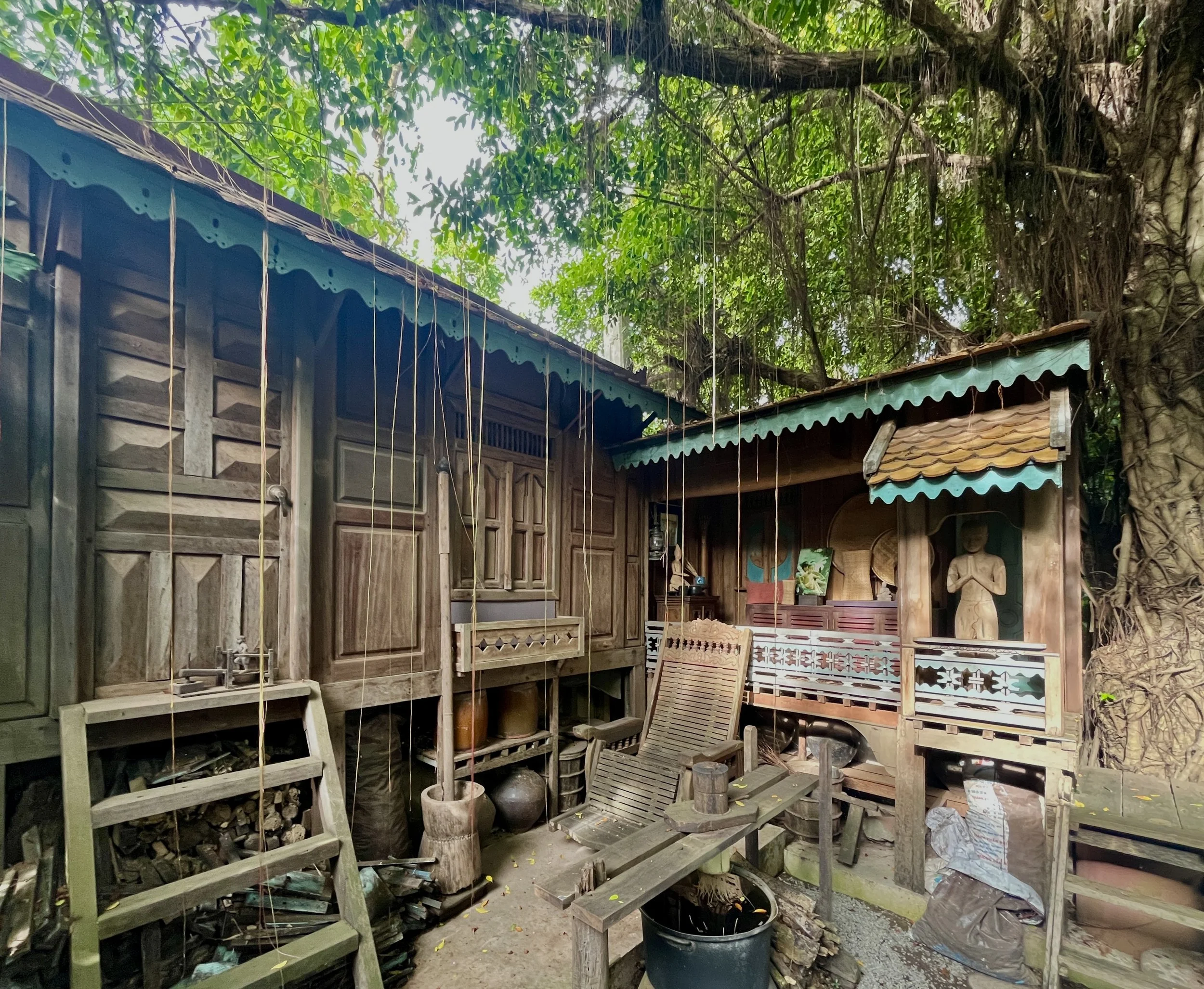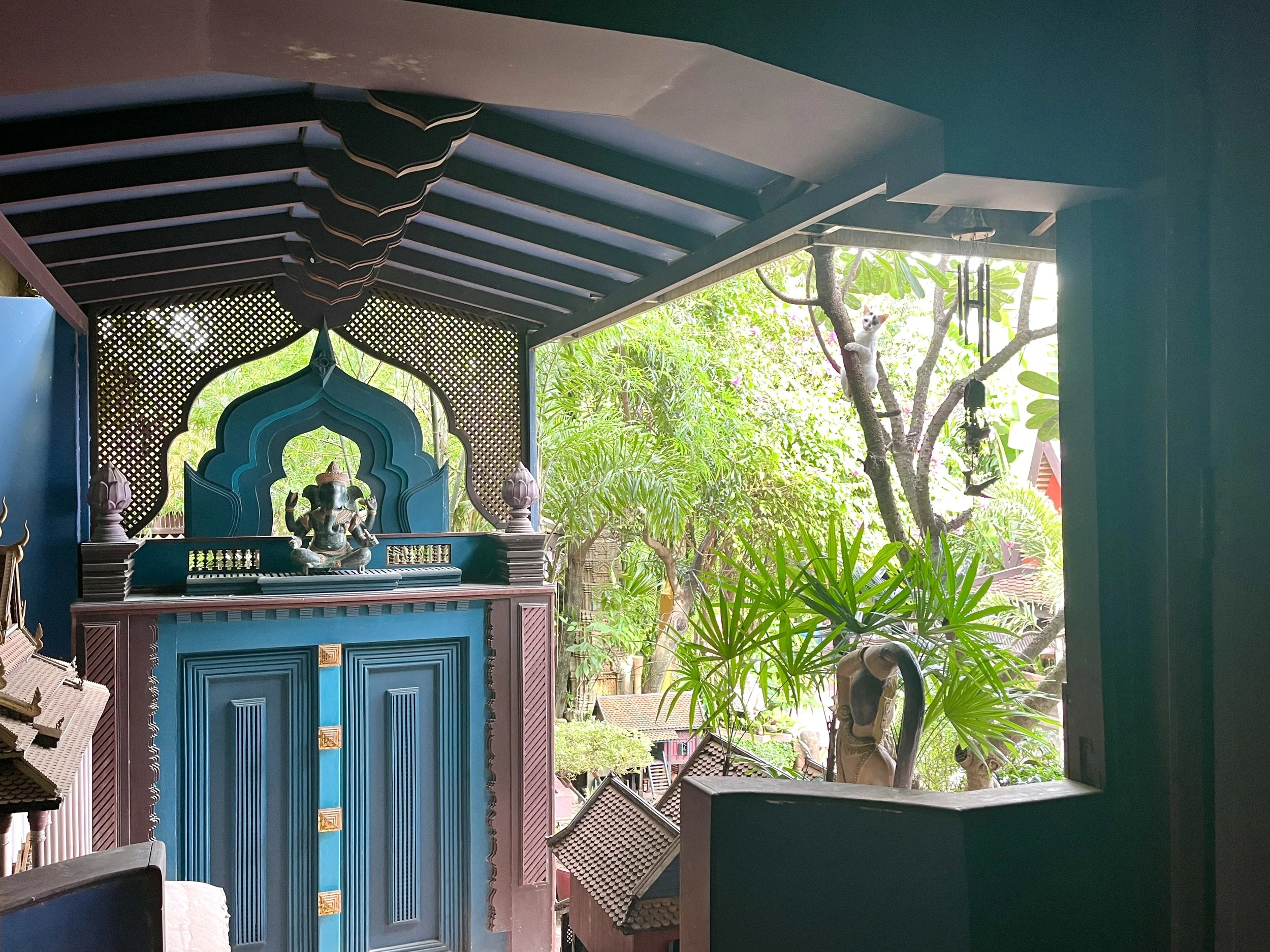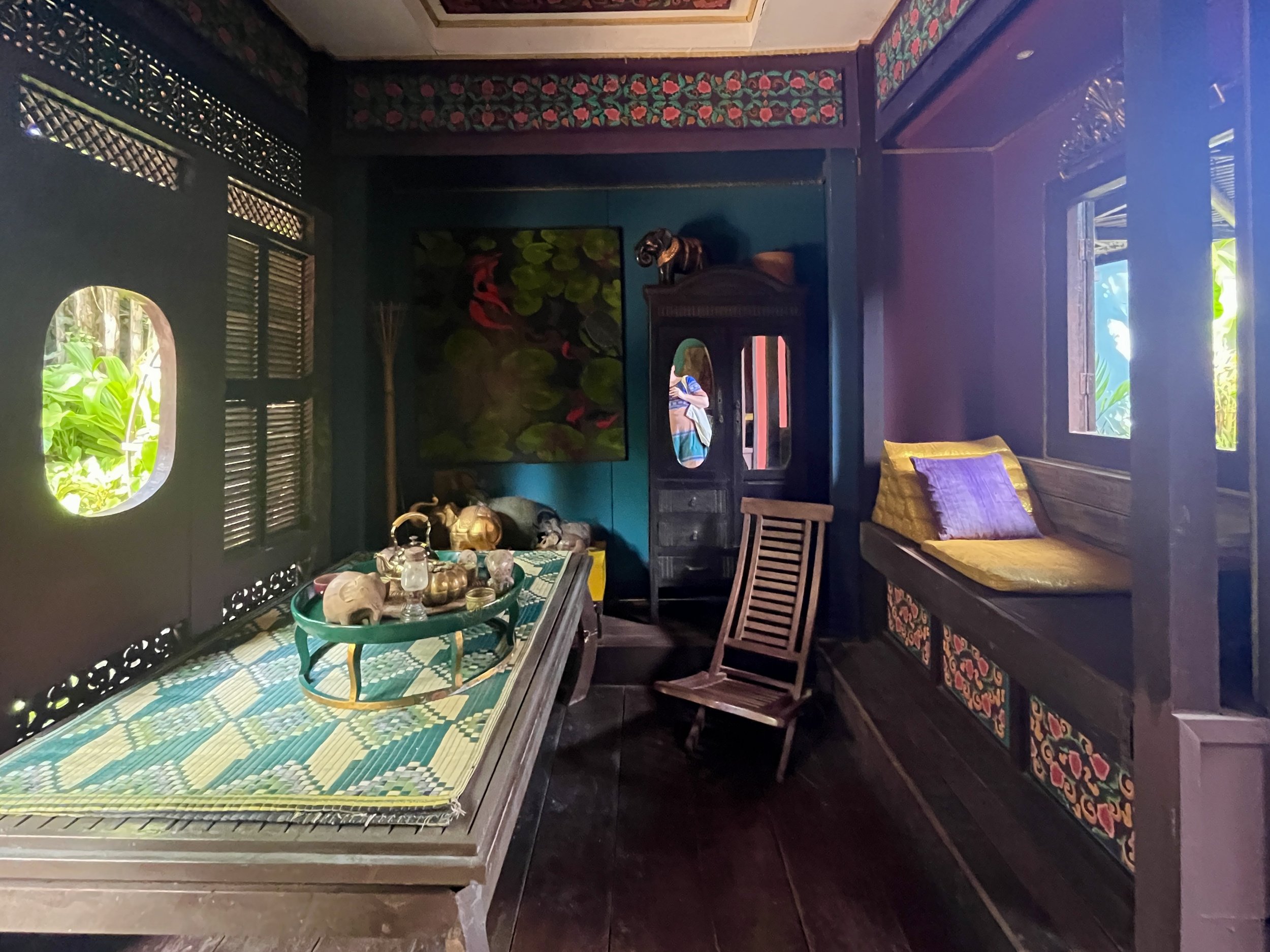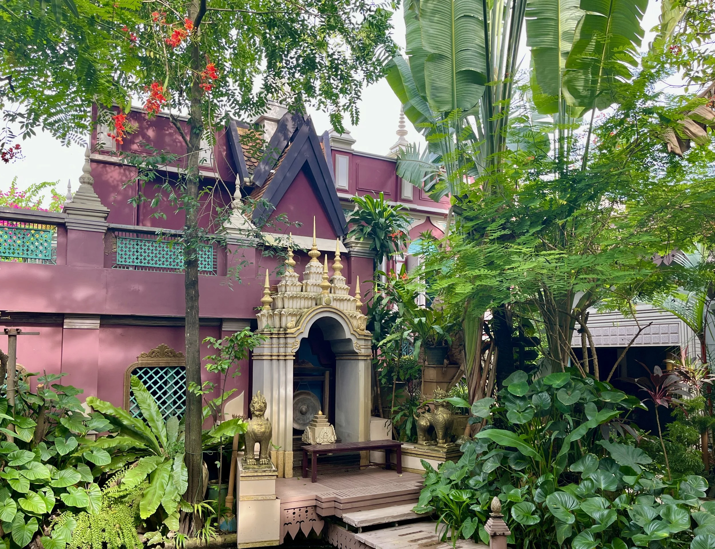 The place is a series of architectural and decorative arts vignettes, composed entirely of traditional crafts and motifs, studded with a few genuine antiques. The skill and taste level here is often mid, but occasionally striking, and rather more delightful when you understand and witness the place as a living document, an open workshop. Theam himself was on the premises when I visited, directing some roofing and repainting of a façade; he noticed me but did not introduce himself. In addition to the introduction to the language of Khmer aesthetics, the thing I appreciated most is his color sense- very different from mine, but I don’t dislike it. Dark chocolate woods and gemtone paints and fabrics figure heavily.