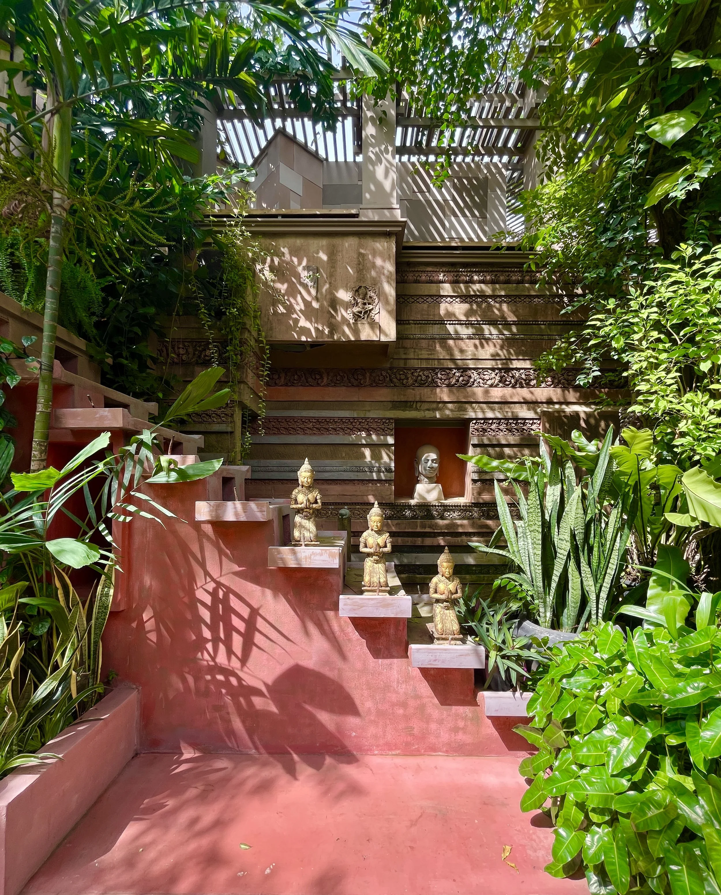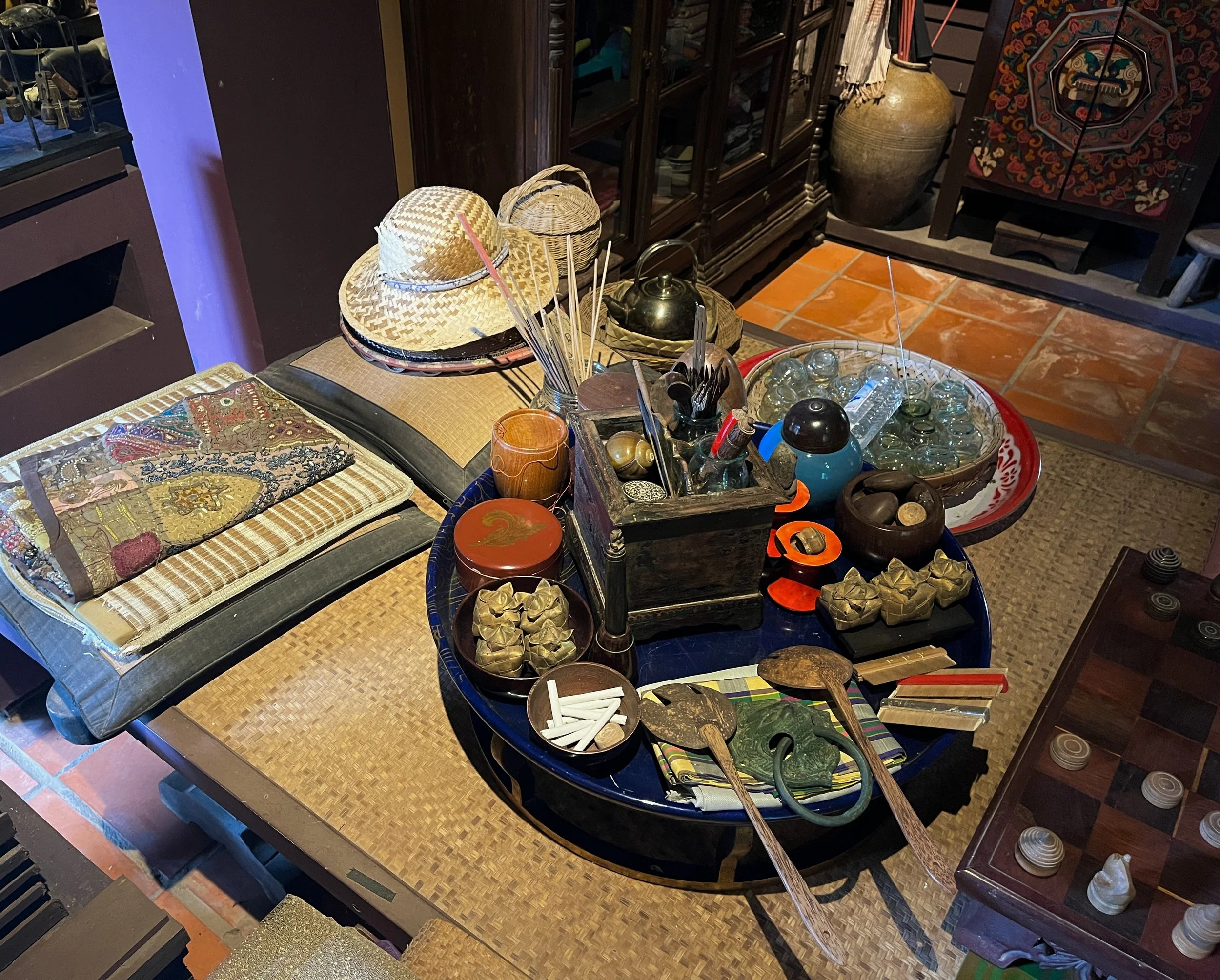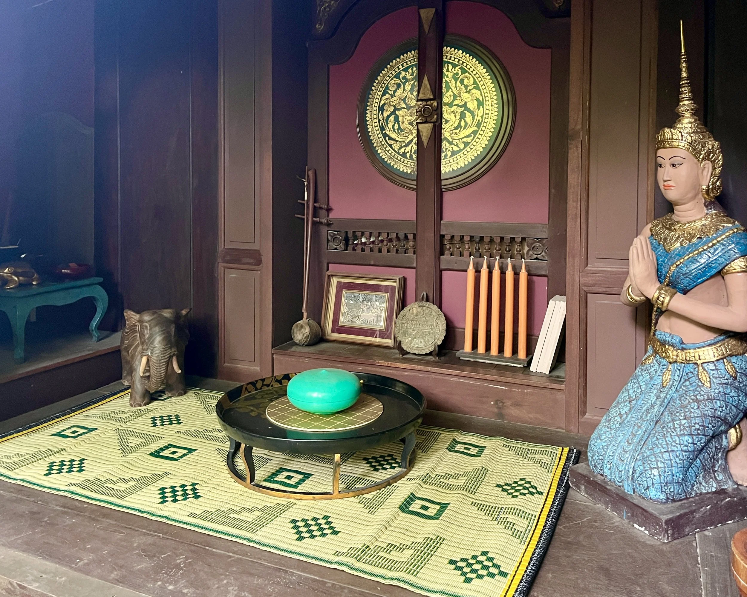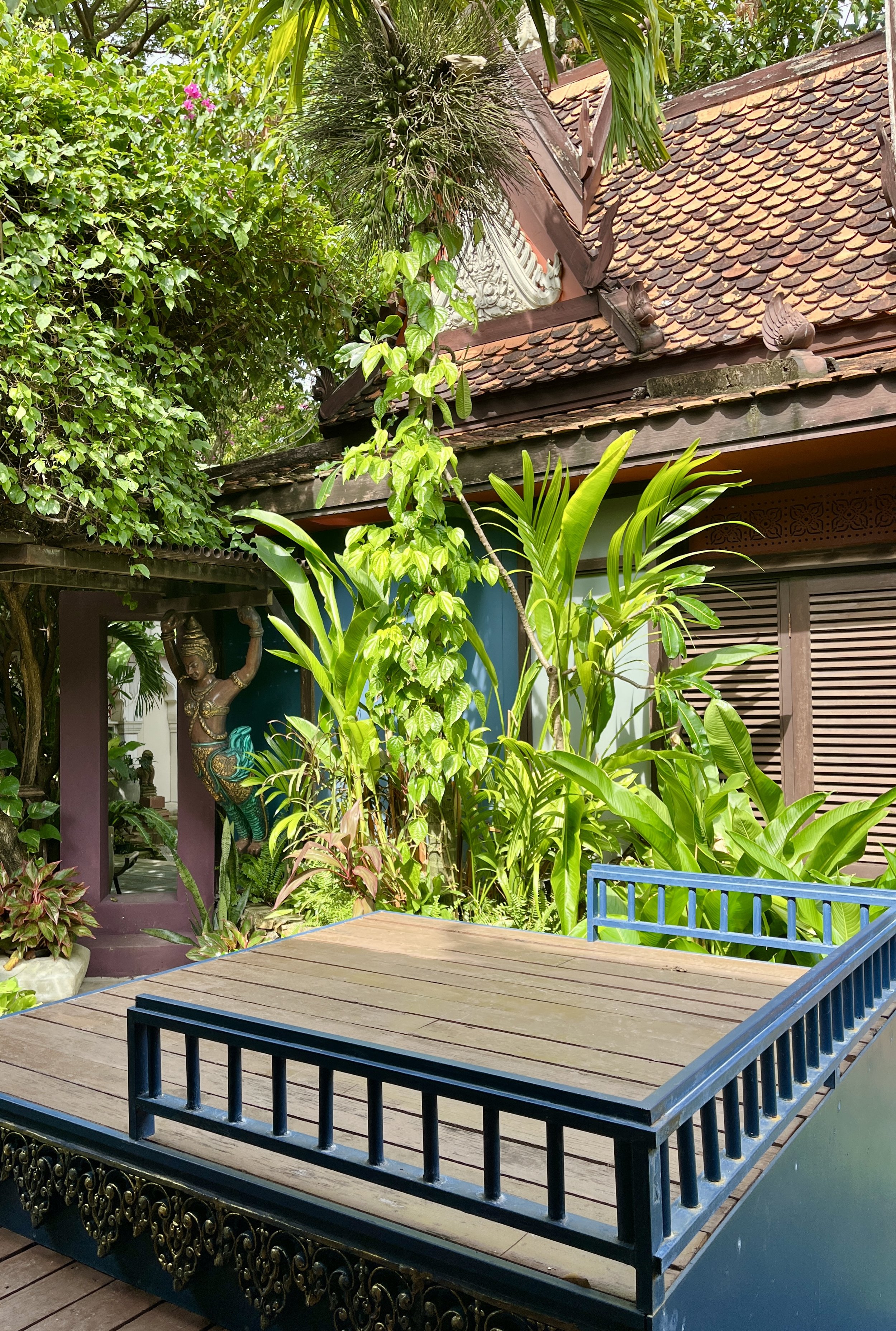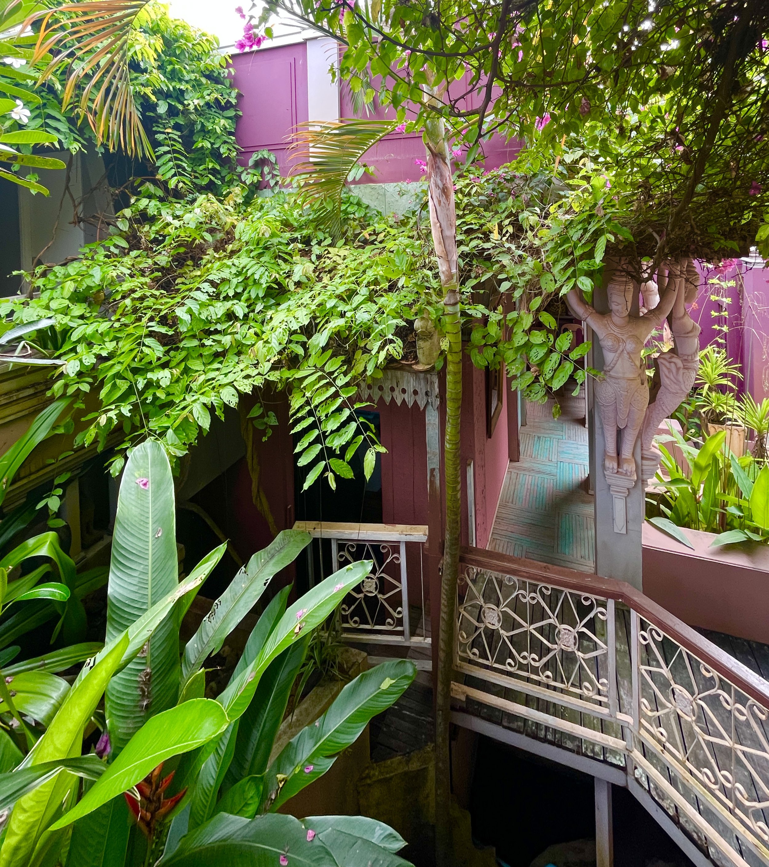 The place is a series of architectural and decorative arts vignettes, composed entirely of traditional crafts and motifs, studded with a few genuine antiques. The skill and taste level here is often mid, but occasionally striking, and rather more delightful when you understand and witness the place as a living document, an open workshop. Theam himself was on the premises when I visited, directing some roofing and repainting of a façade; he noticed me but did not introduce himself. In addition to the introduction to the language of Khmer aesthetics, the thing I appreciated most is his color sense- very different from mine, but I don’t dislike it. Dark chocolate woods and gemtone paints and fabrics figure heavily.