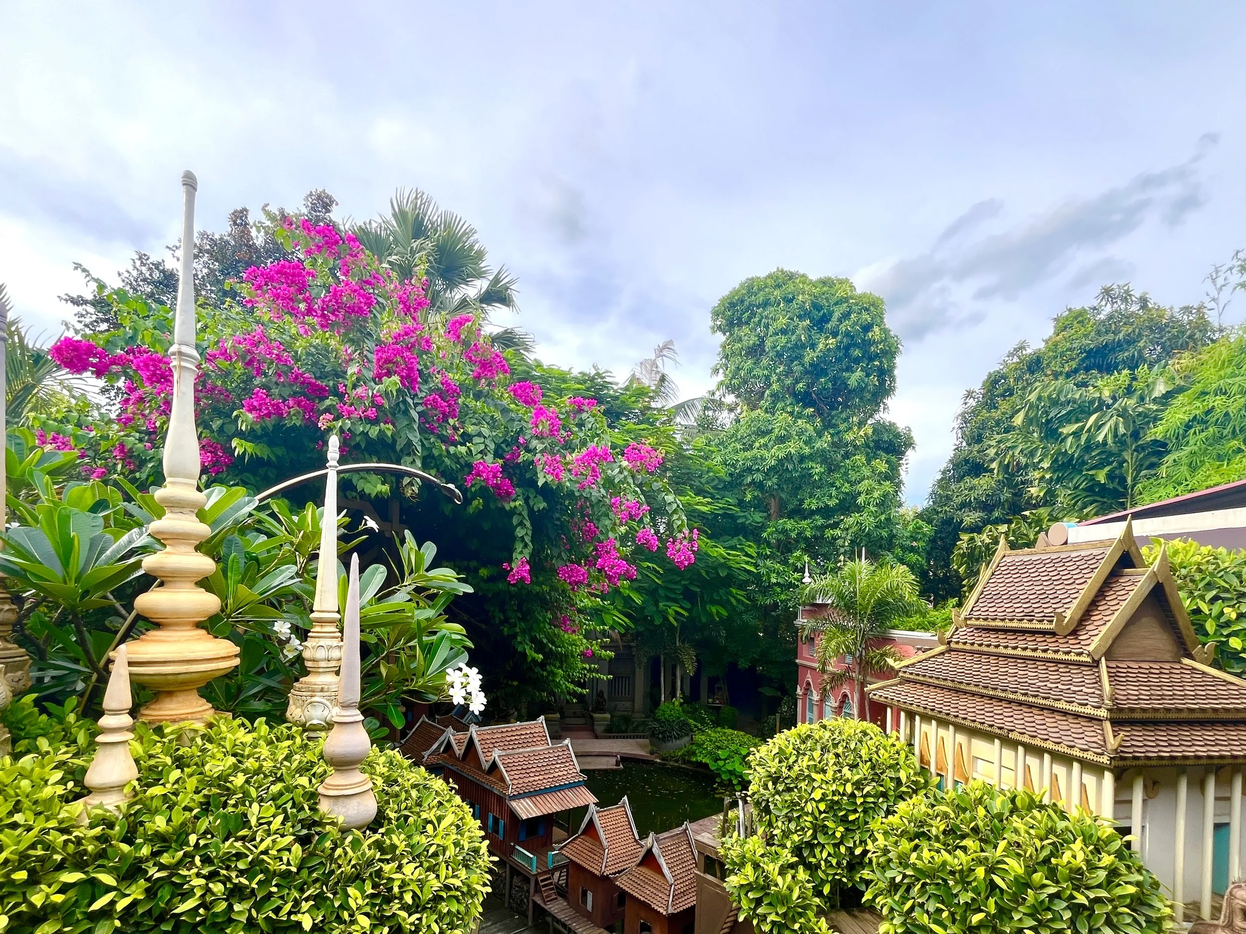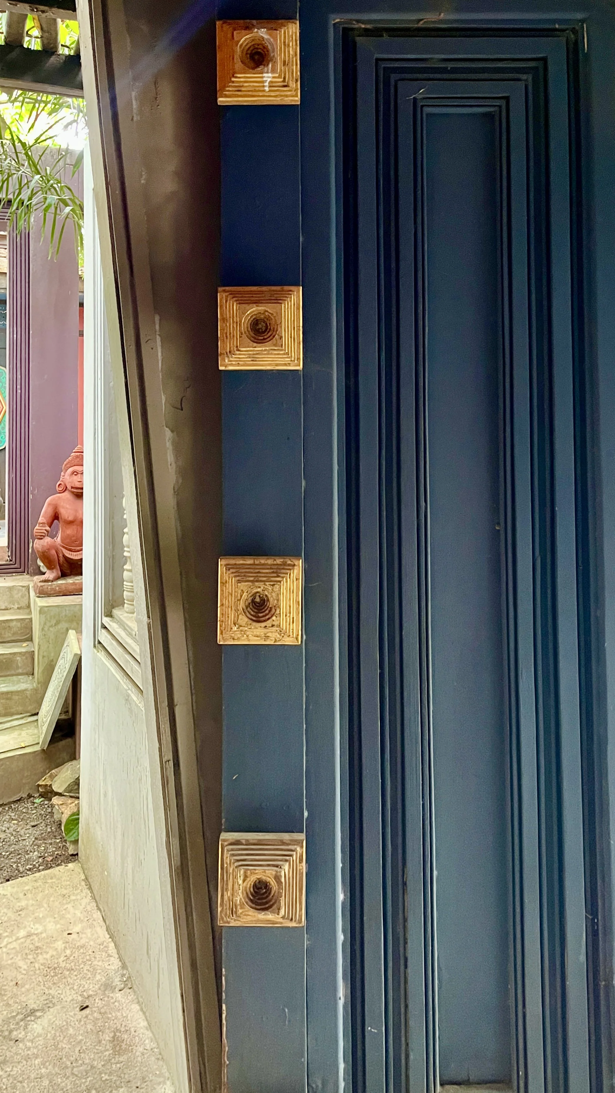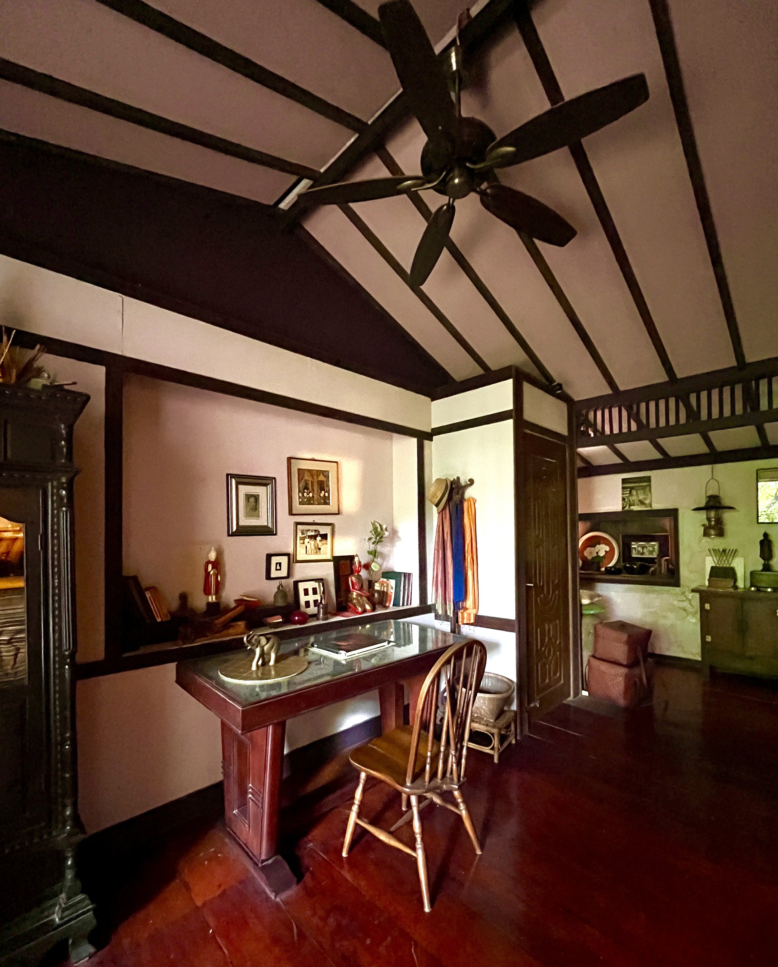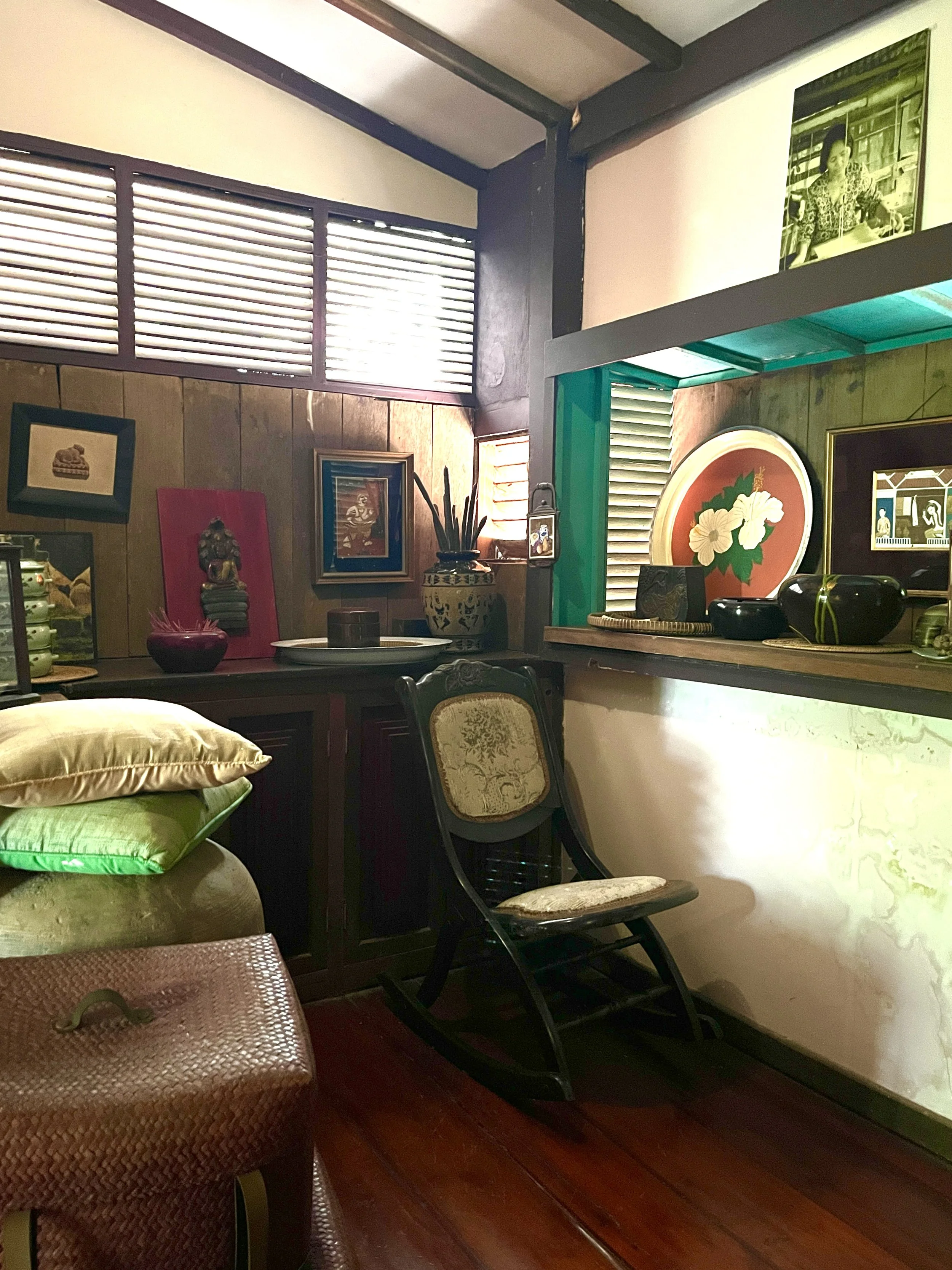 The place is a series of architectural and decorative arts vignettes, composed entirely of traditional crafts and motifs, studded with a few genuine antiques. The skill and taste level here is often mid, but occasionally striking, and rather more delightful when you understand and witness the place as a living document, an open workshop. Theam himself was on the premises when I visited, directing some roofing and repainting of a façade; he noticed me but did not introduce himself. In addition to the introduction to the language of Khmer aesthetics, the thing I appreciated most is his color sense- very different from mine, but I don’t dislike it. Dark chocolate woods and gemtone paints and fabrics figure heavily.
