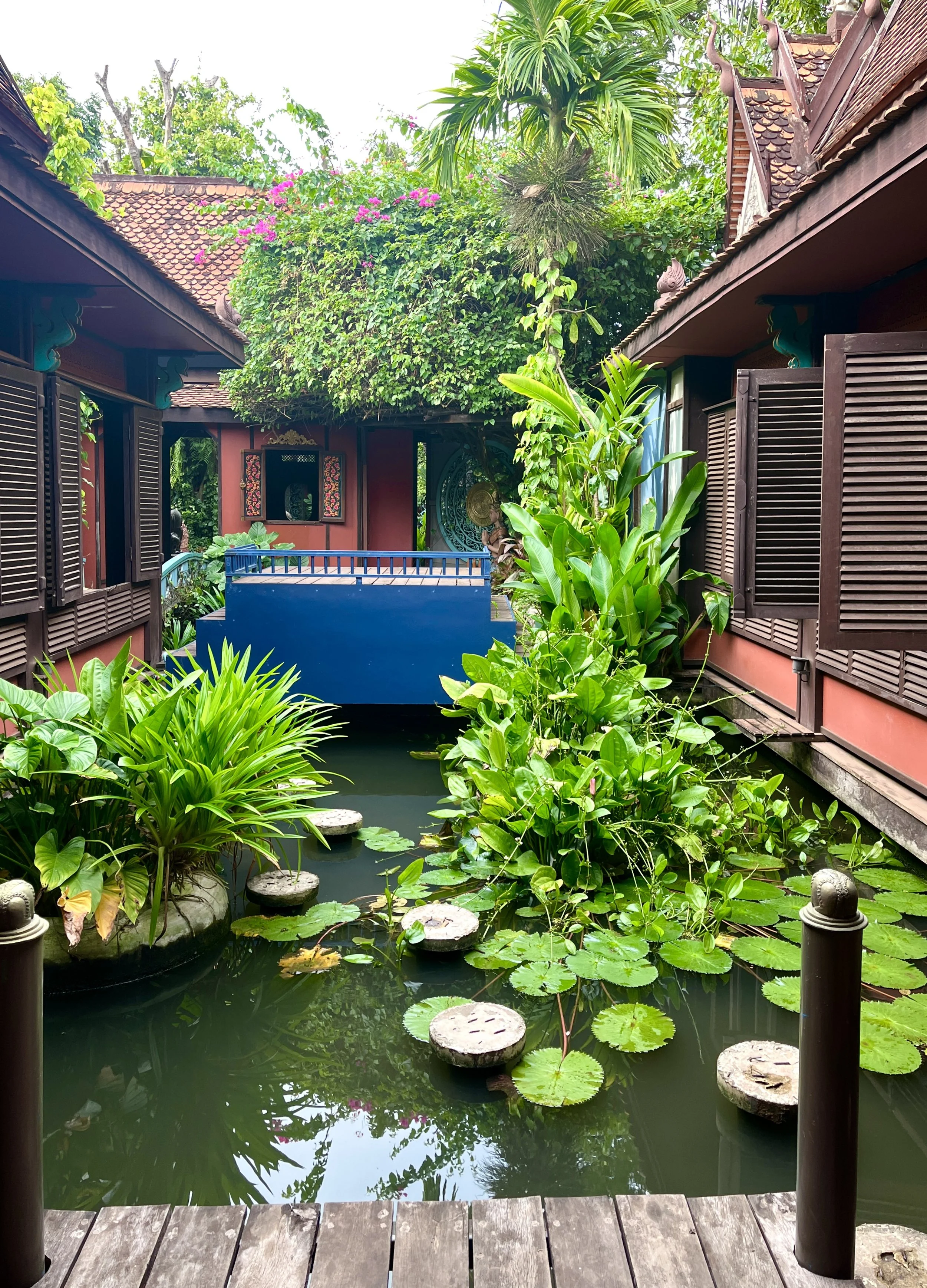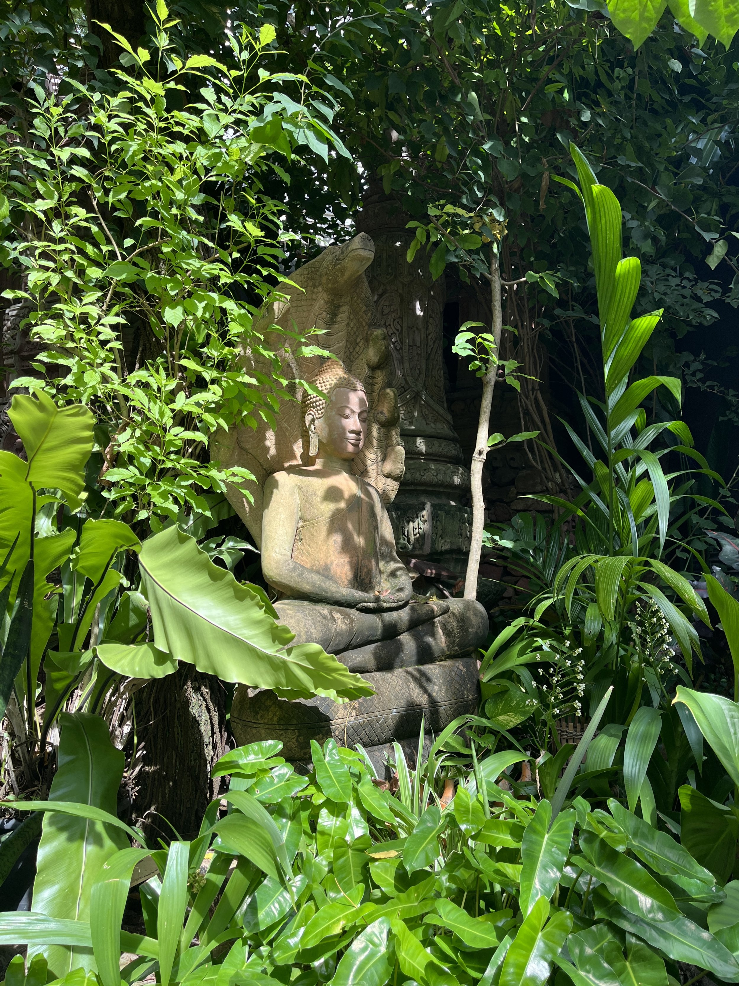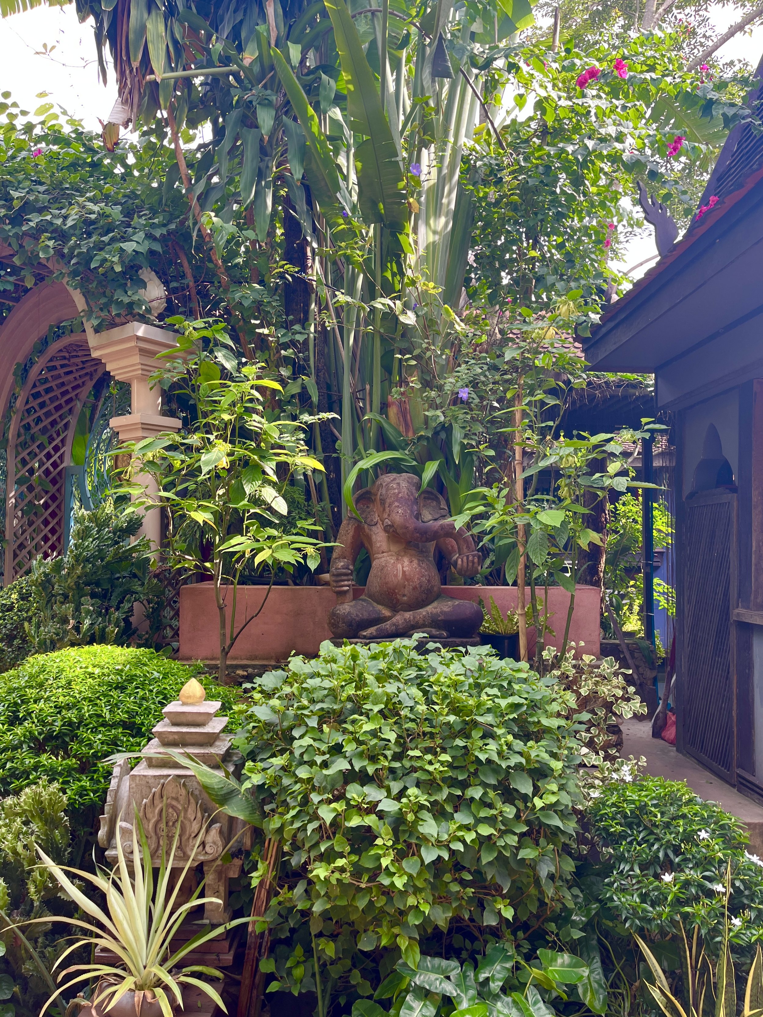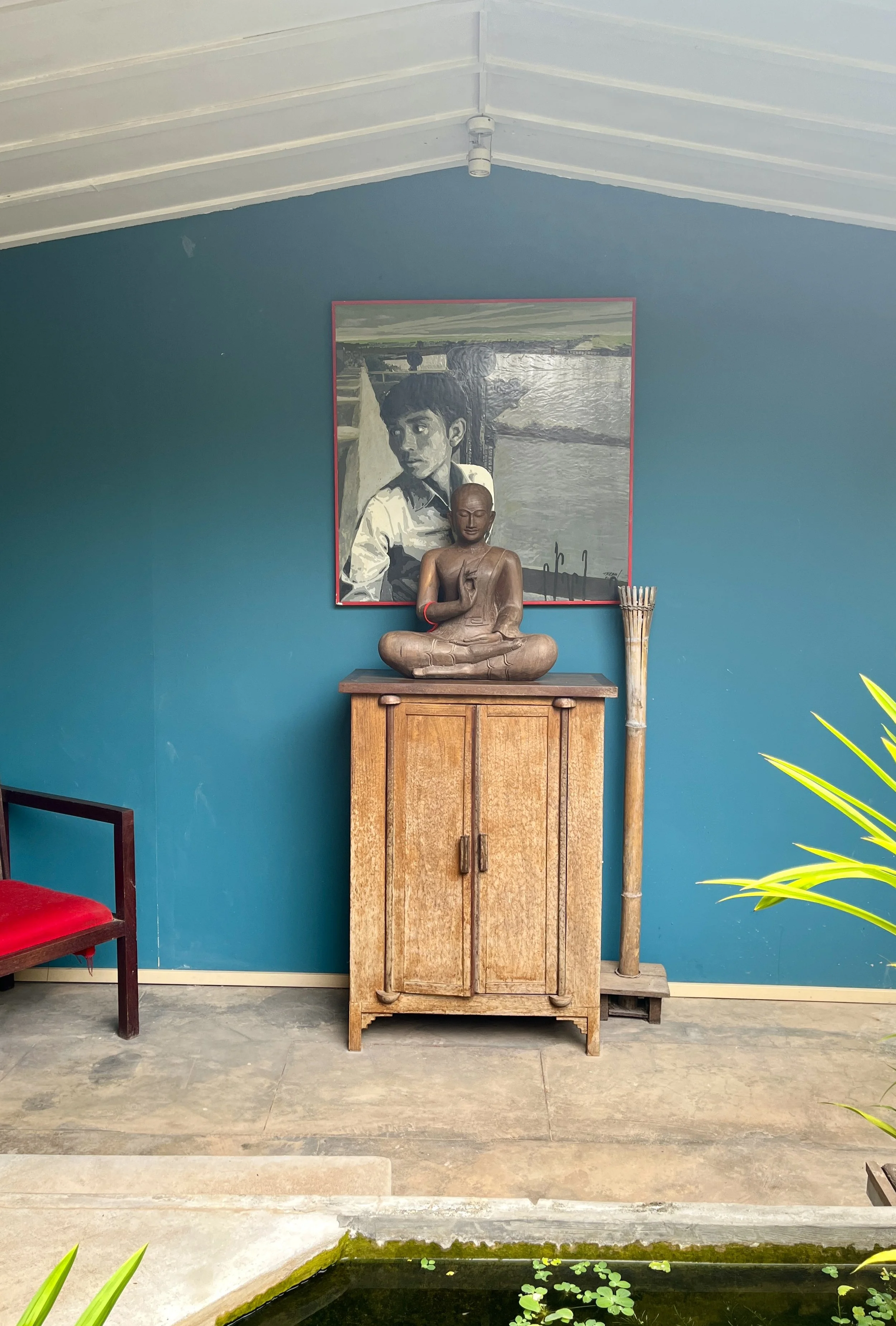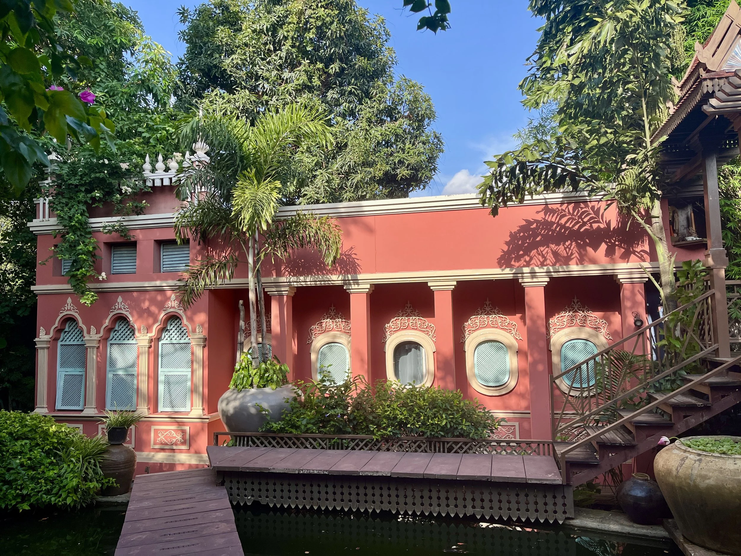 The place is a series of architectural and decorative arts vignettes, composed entirely of traditional crafts and motifs, studded with a few genuine antiques. The skill and taste level here is often mid, but occasionally striking, and rather more delightful when you understand and witness the place as a living document, an open workshop. Theam himself was on the premises when I visited, directing some roofing and repainting of a façade; he noticed me but did not introduce himself. In addition to the introduction to the language of Khmer aesthetics, the thing I appreciated most is his color sense- very different from mine, but I don’t dislike it. Dark chocolate woods and gemtone paints and fabrics figure heavily.