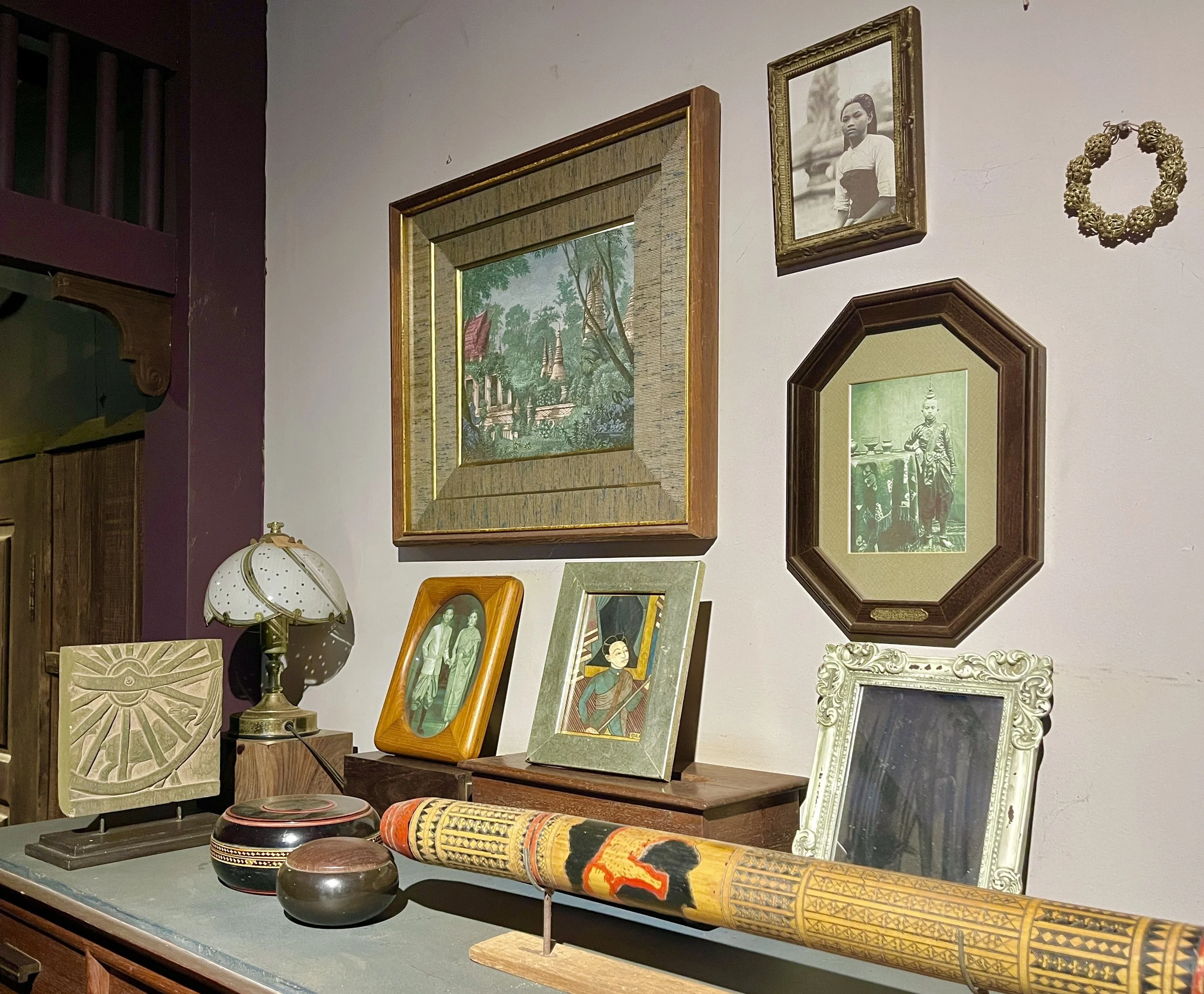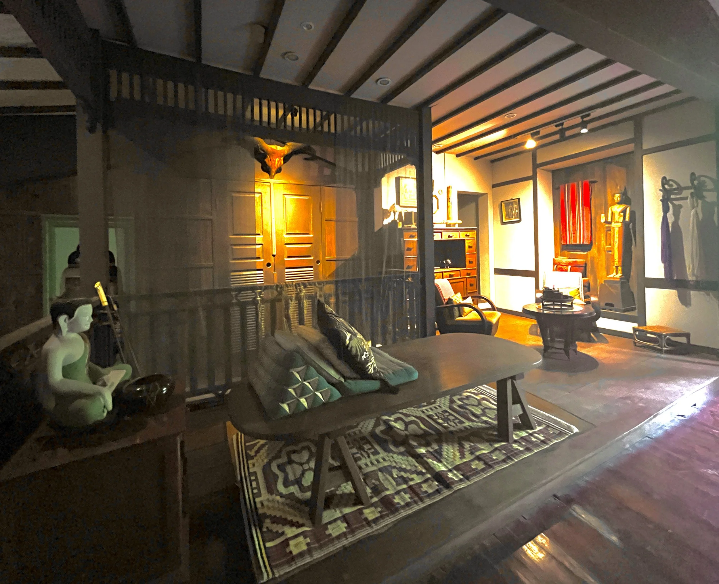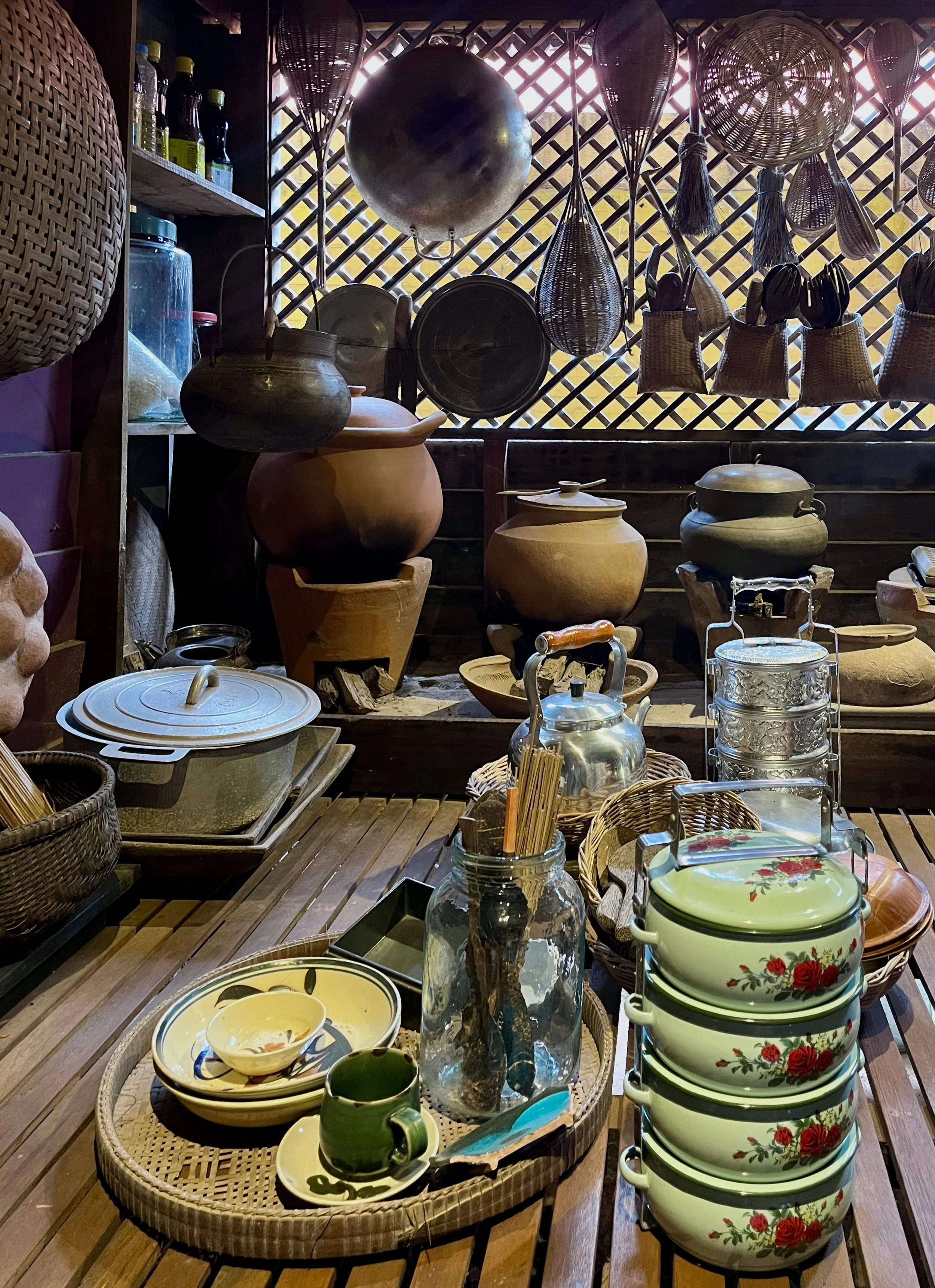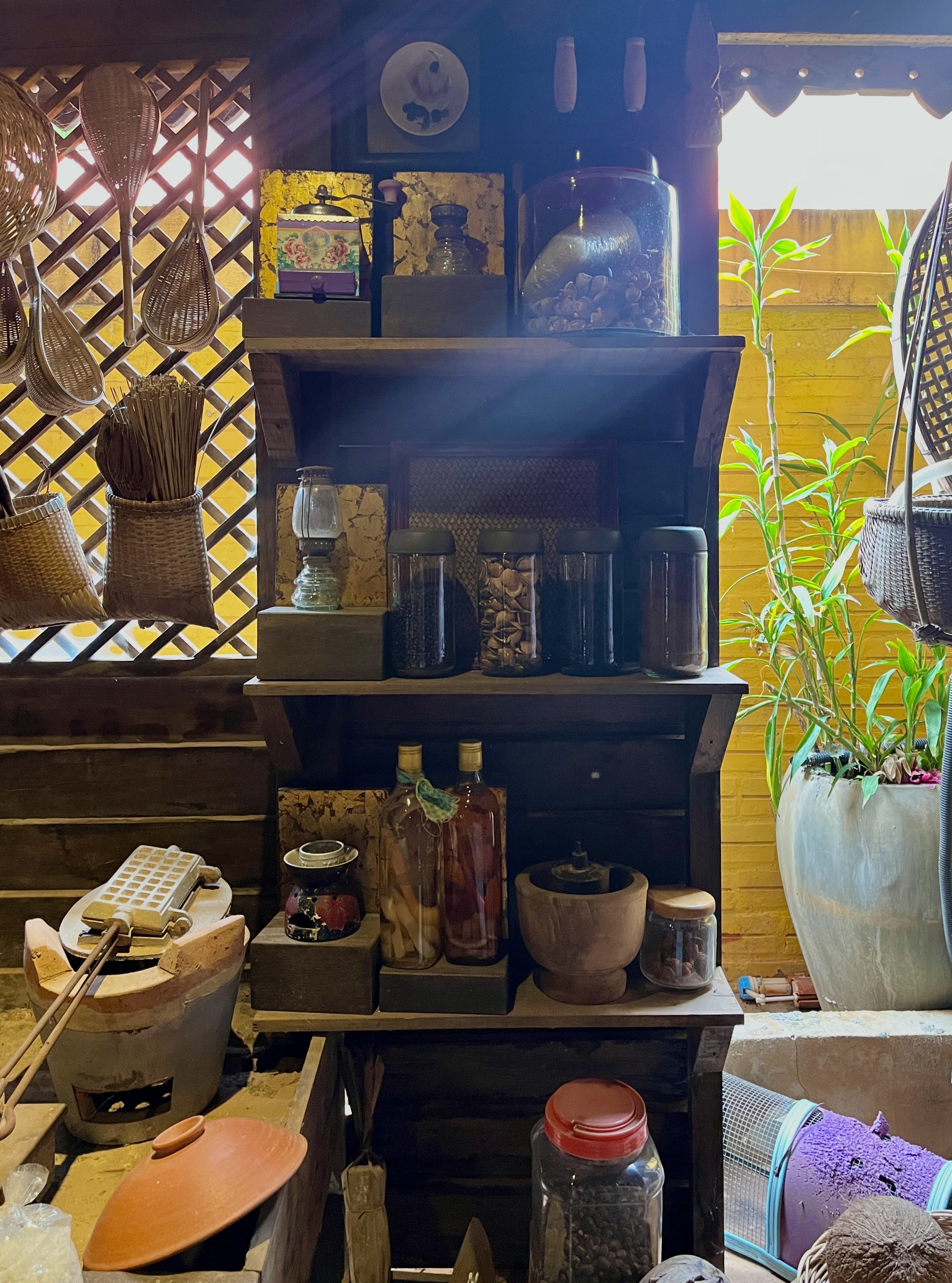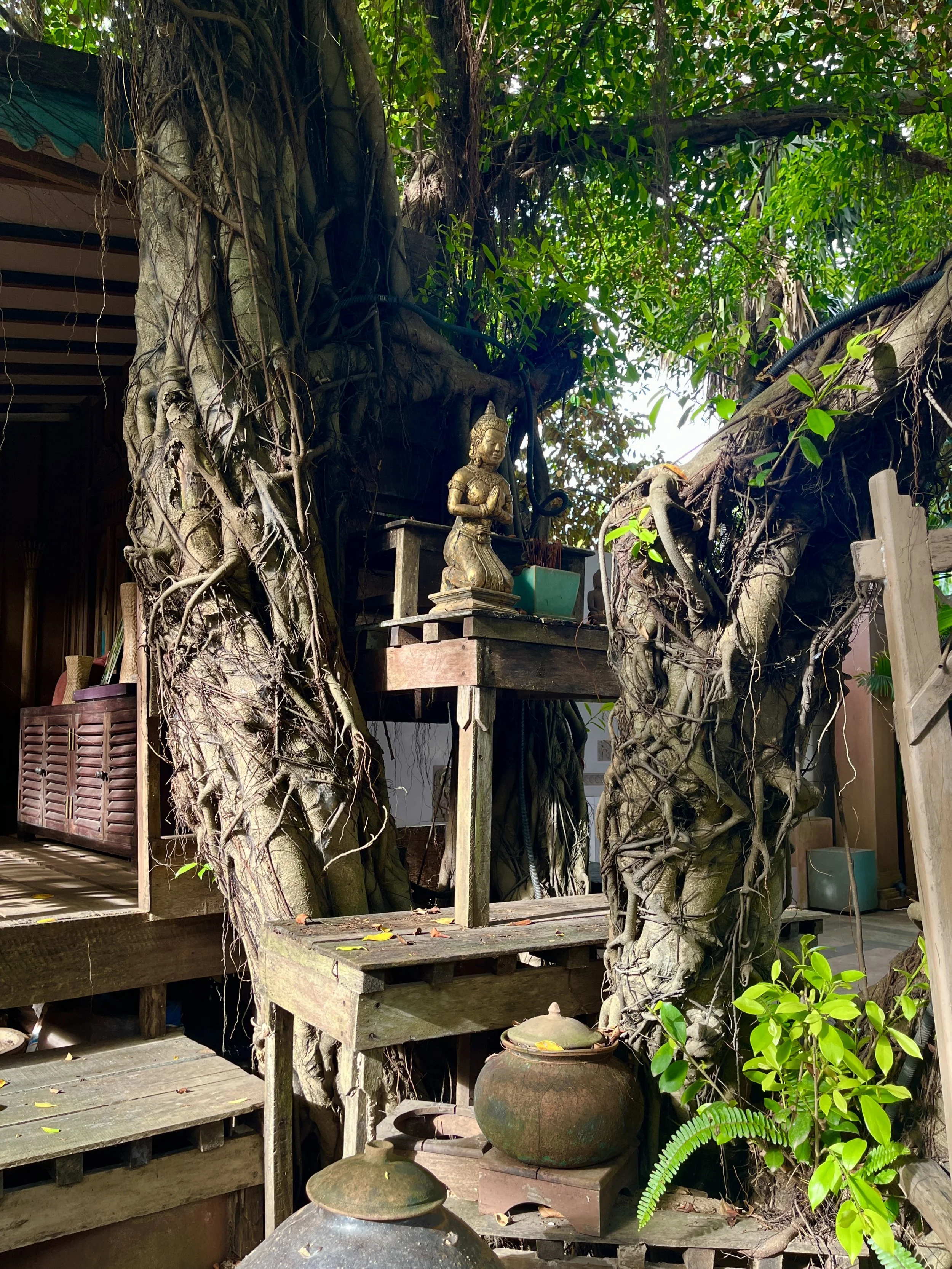 The place is a series of architectural and decorative arts vignettes, composed entirely of traditional crafts and motifs, studded with a few genuine antiques. The skill and taste level here is often mid, but occasionally striking, and rather more delightful when you understand and witness the place as a living document, an open workshop. Theam himself was on the premises when I visited, directing some roofing and repainting of a façade; he noticed me but did not introduce himself. In addition to the introduction to the language of Khmer aesthetics, the thing I appreciated most is his color sense- very different from mine, but I don’t dislike it. Dark chocolate woods and gemtone paints and fabrics figure heavily.