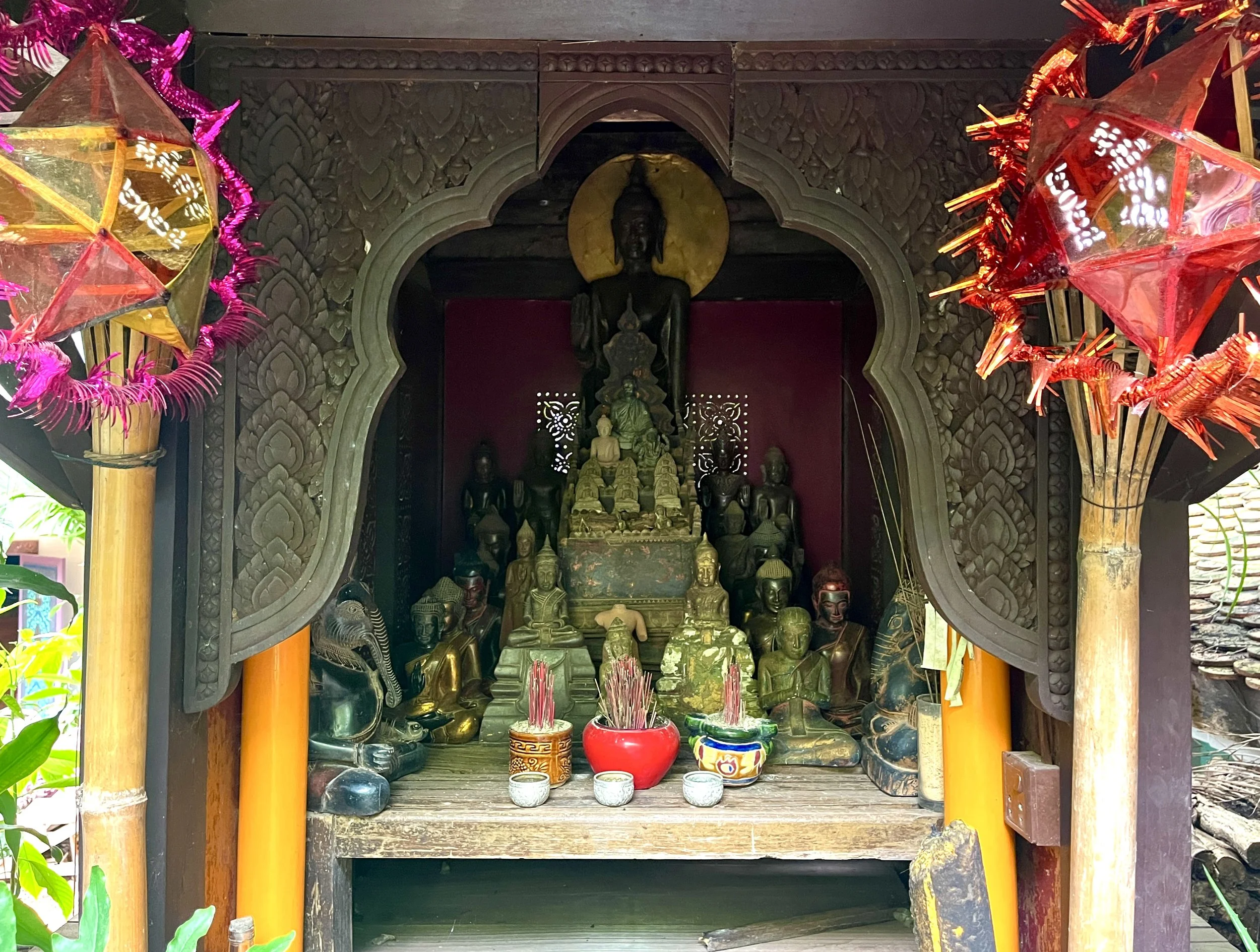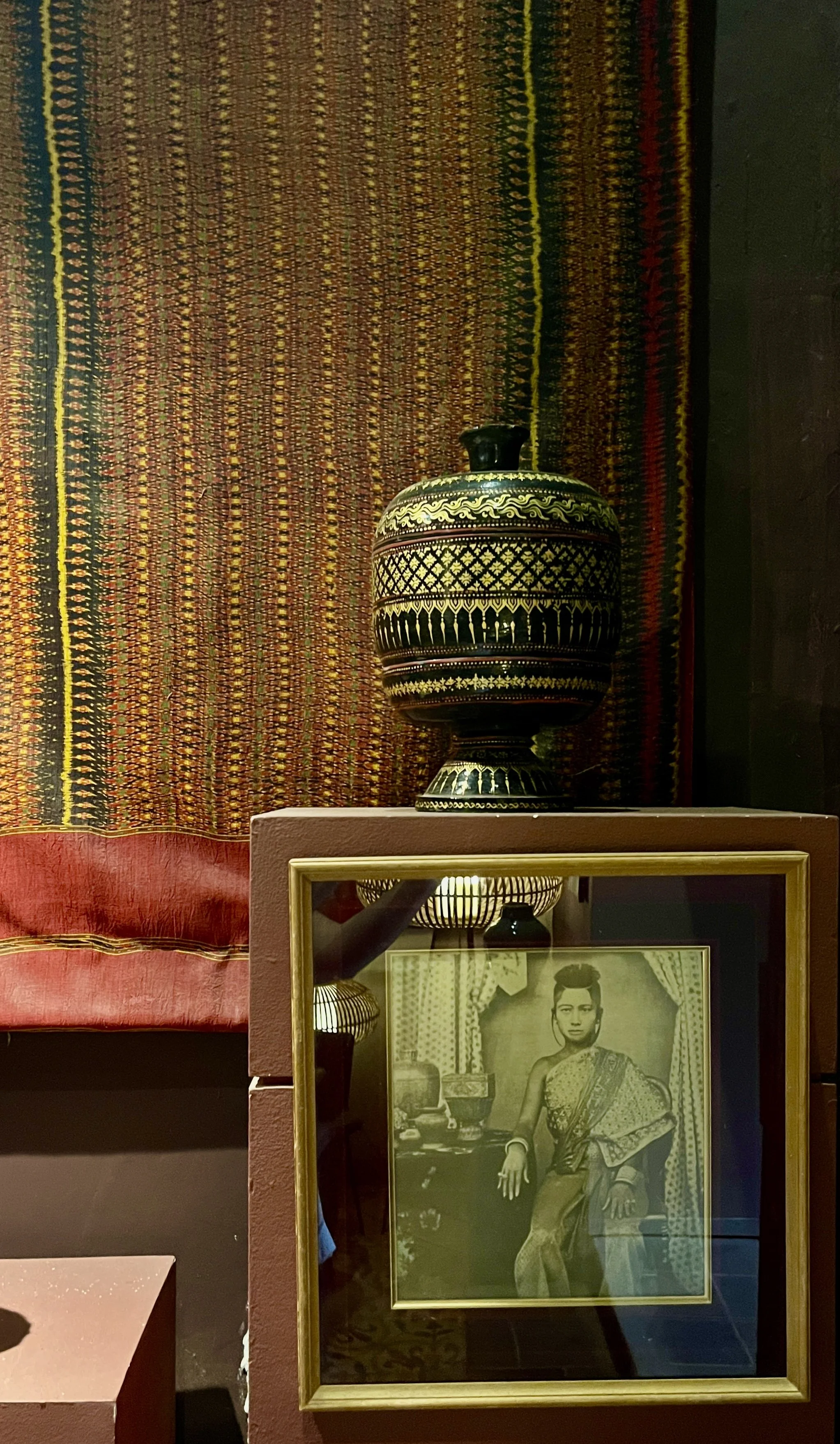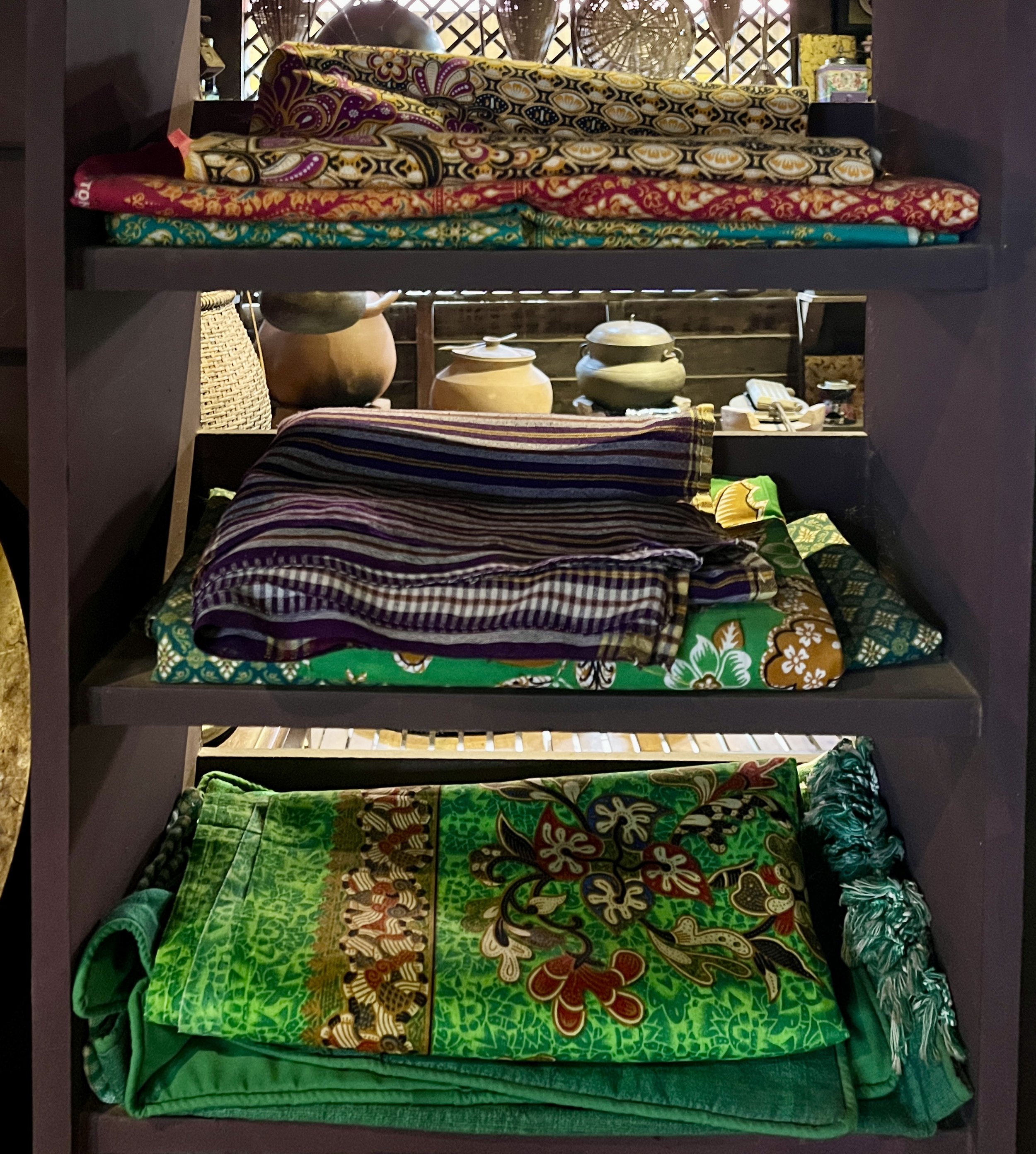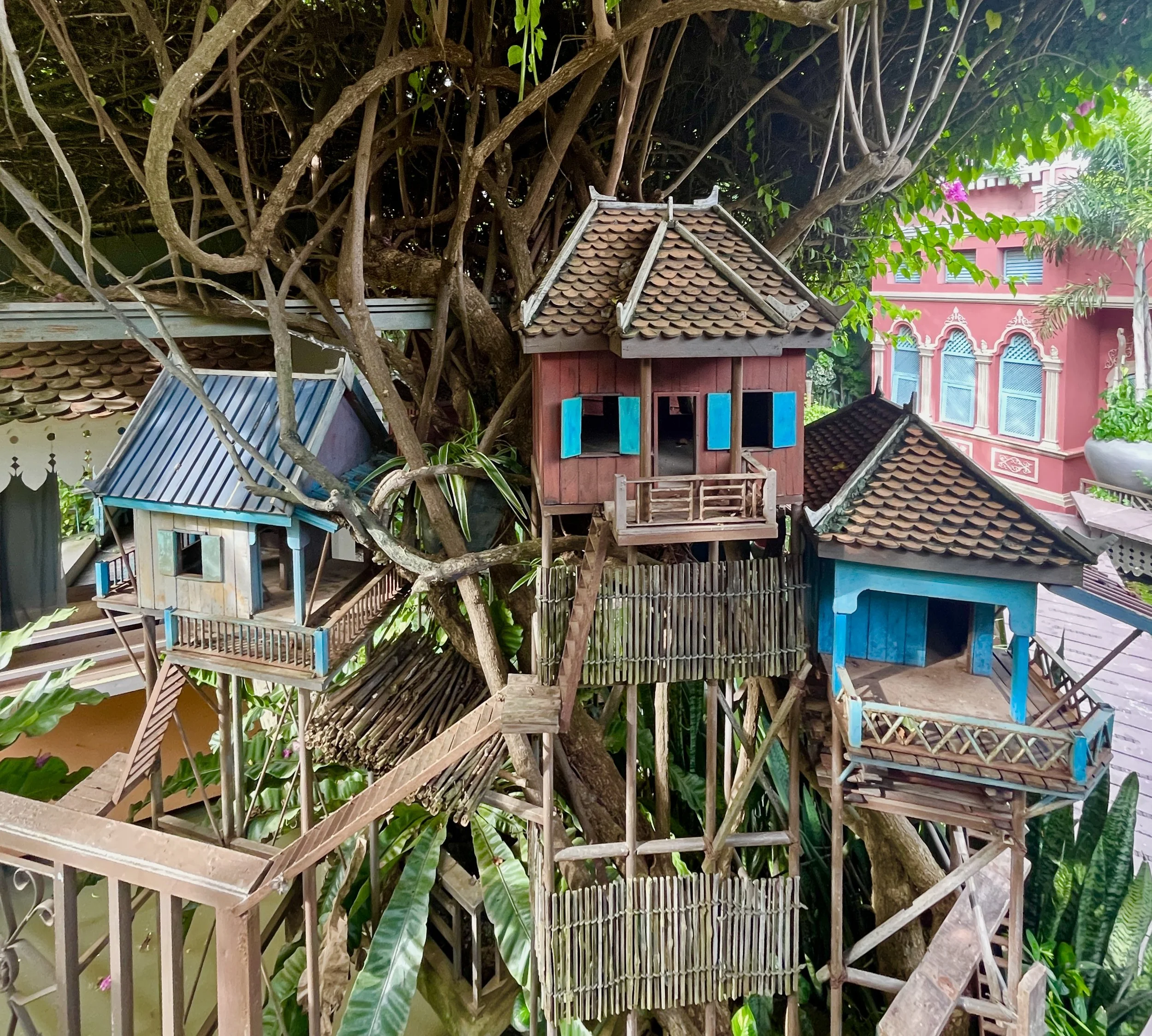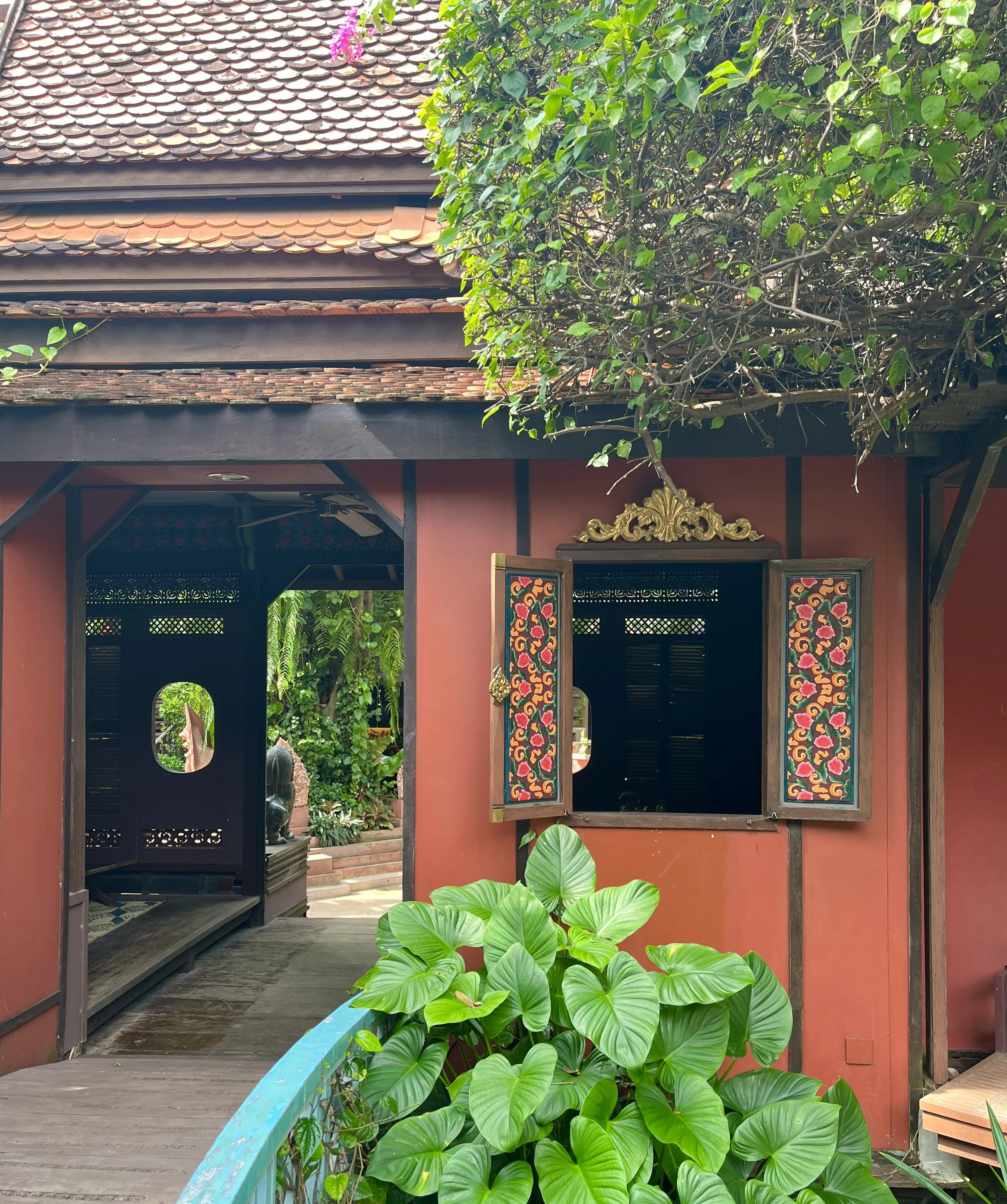 The place is a series of architectural and decorative arts vignettes, composed entirely of traditional crafts and motifs, studded with a few genuine antiques. The skill and taste level here is often mid, but occasionally striking, and rather more delightful when you understand and witness the place as a living document, an open workshop. Theam himself was on the premises when I visited, directing some roofing and repainting of a façade; he noticed me but did not introduce himself. In addition to the introduction to the language of Khmer aesthetics, the thing I appreciated most is his color sense- very different from mine, but I don’t dislike it. Dark chocolate woods and gemtone paints and fabrics figure heavily.