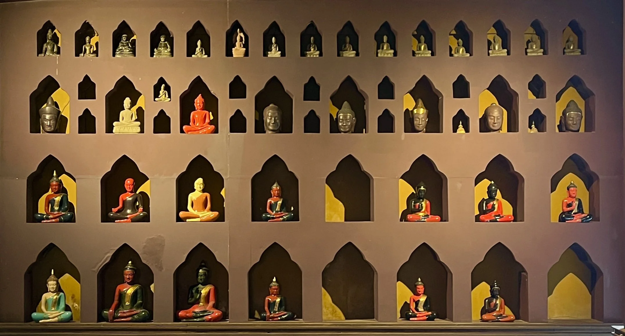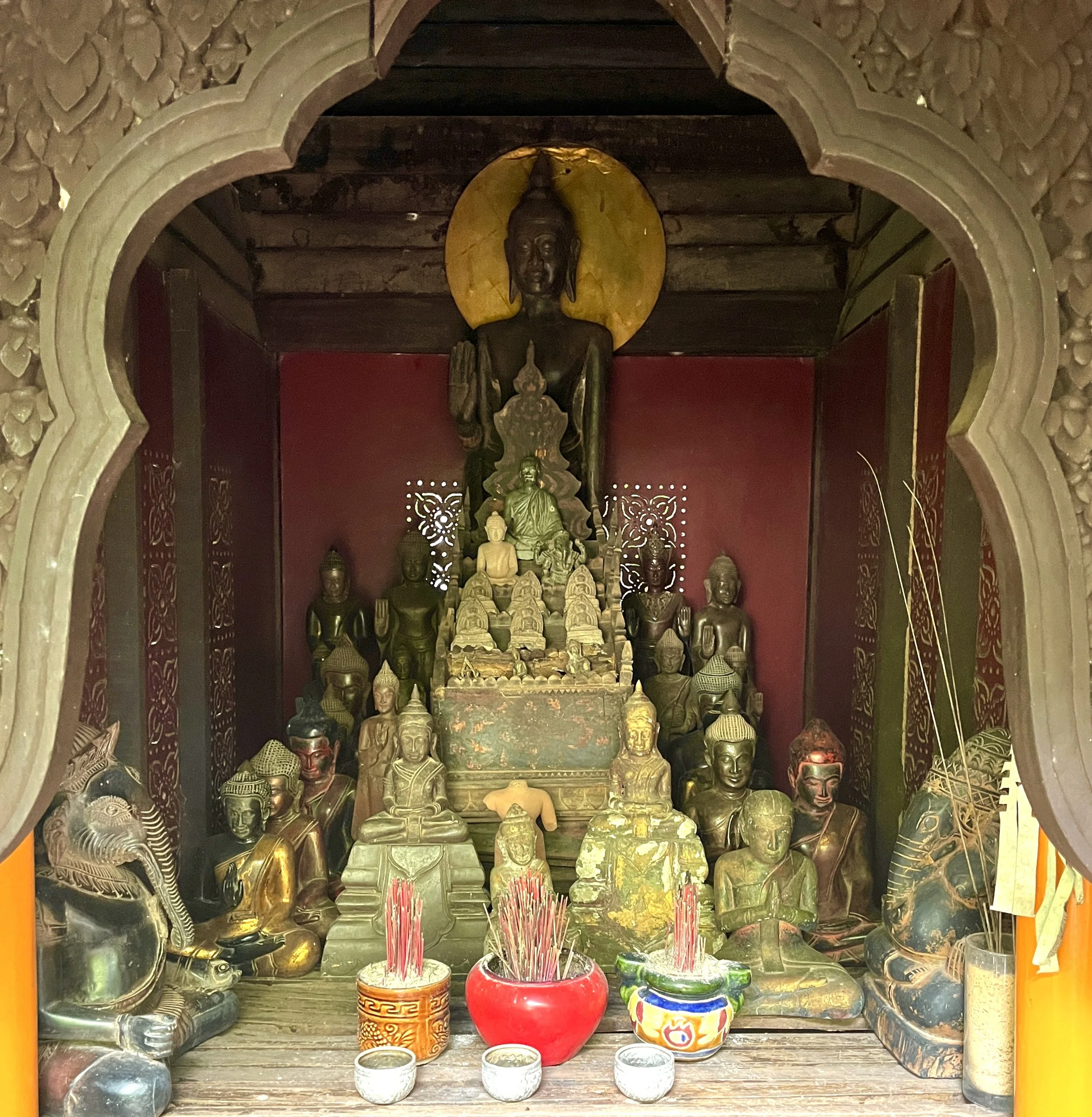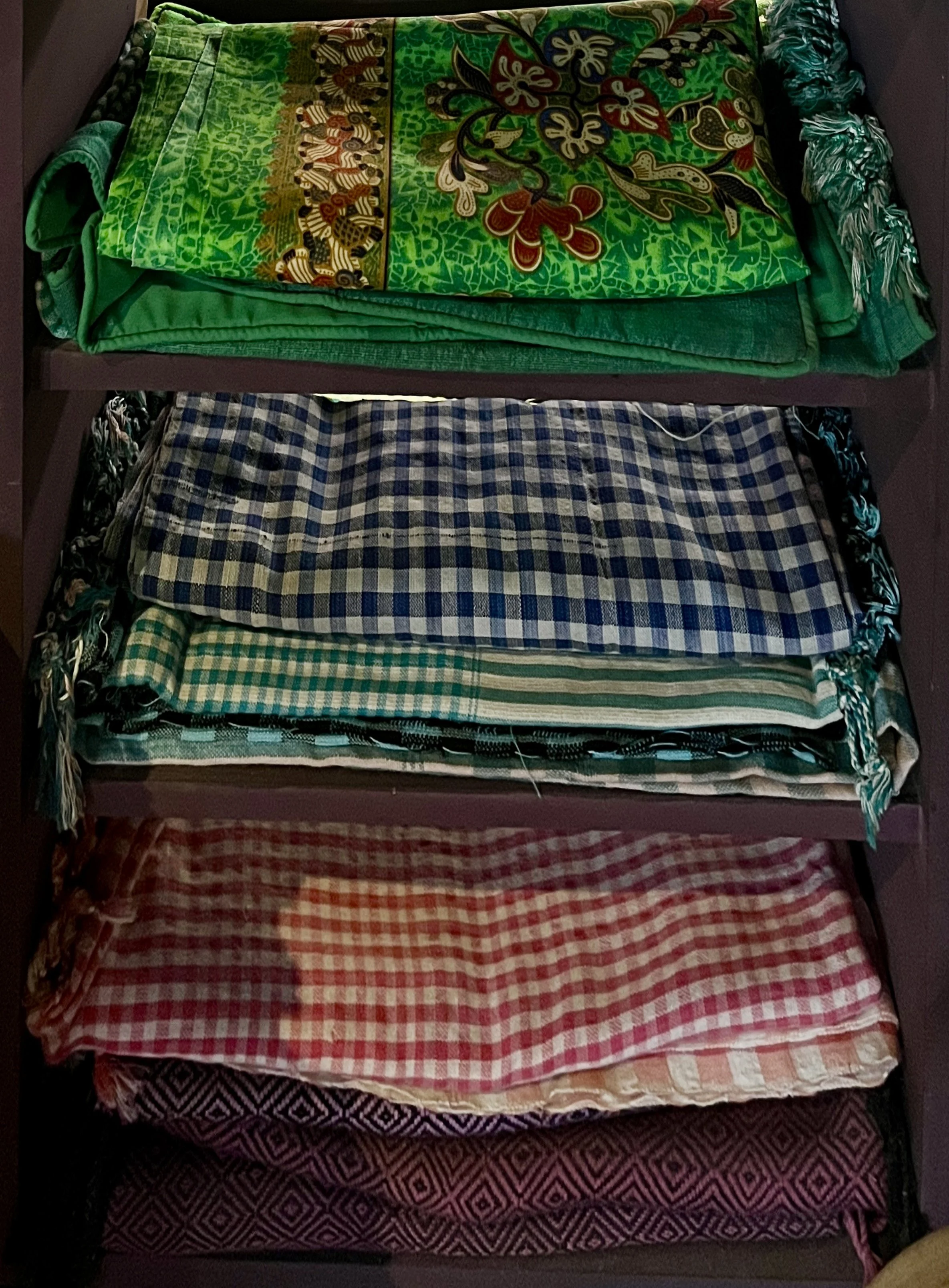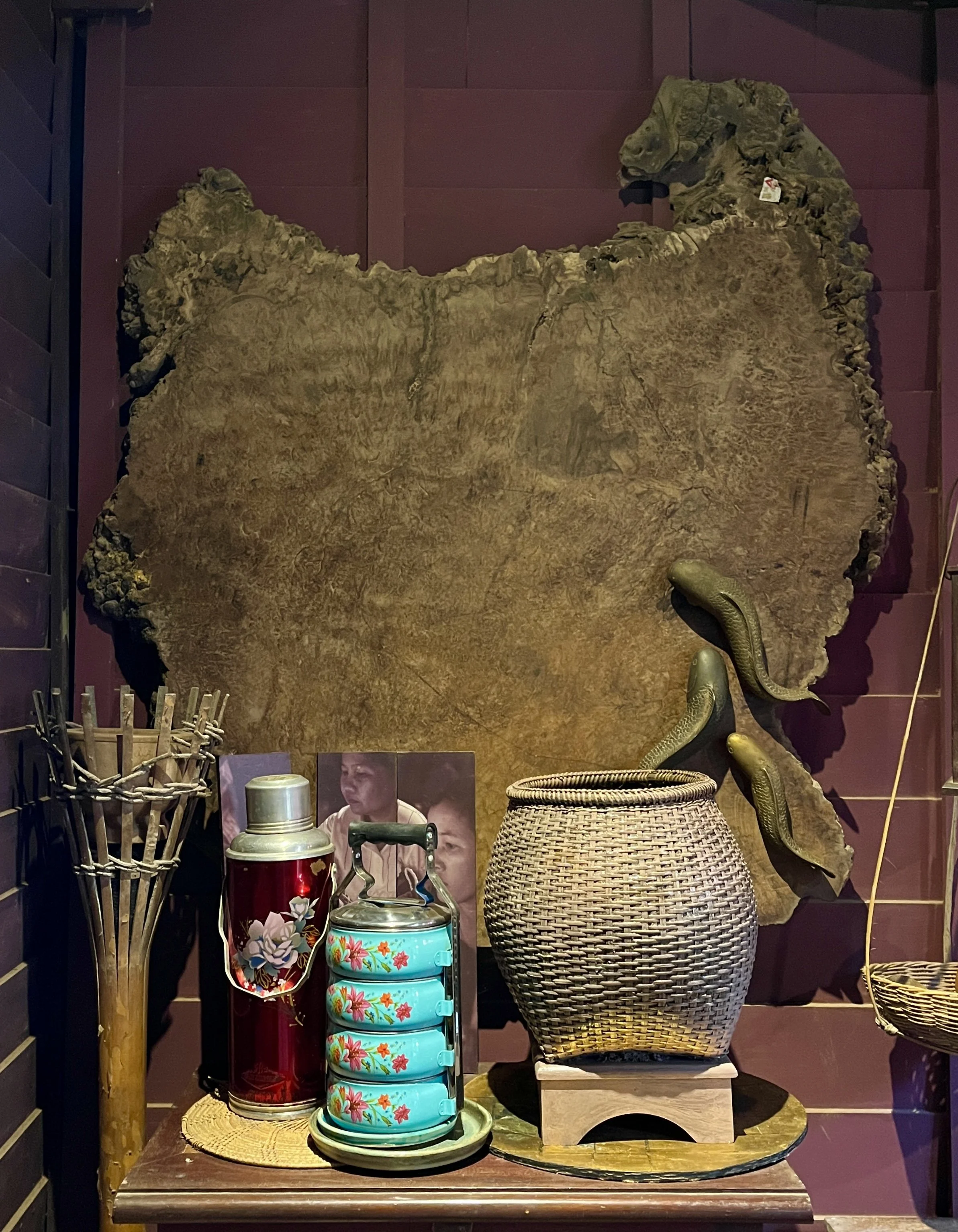The place is a series of architectural and decorative arts vignettes, composed entirely of traditional crafts and motifs, studded with a few genuine antiques. The skill and taste level here is often mid, but occasionally striking, and rather more delightful when you understand and witness the place as a living document, an open workshop. Theam himself was on the premises when I visited, directing some roofing and repainting of a façade; he noticed me but did not introduce himself. In addition to the introduction to the language of Khmer aesthetics, the thing I appreciated most is his color sense- very different from mine, but I don’t dislike it. Dark chocolate woods and gemtone paints and fabrics figure heavily.