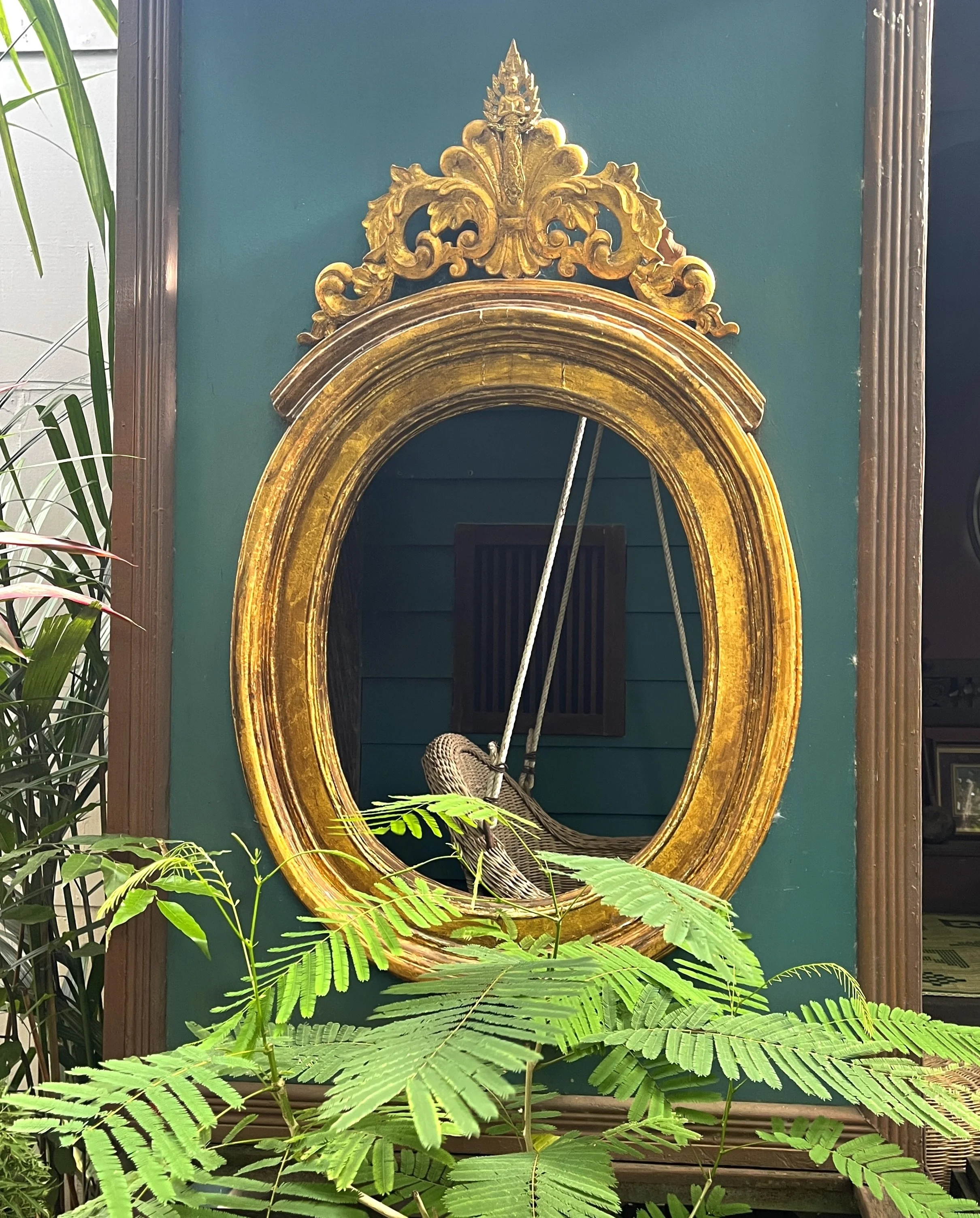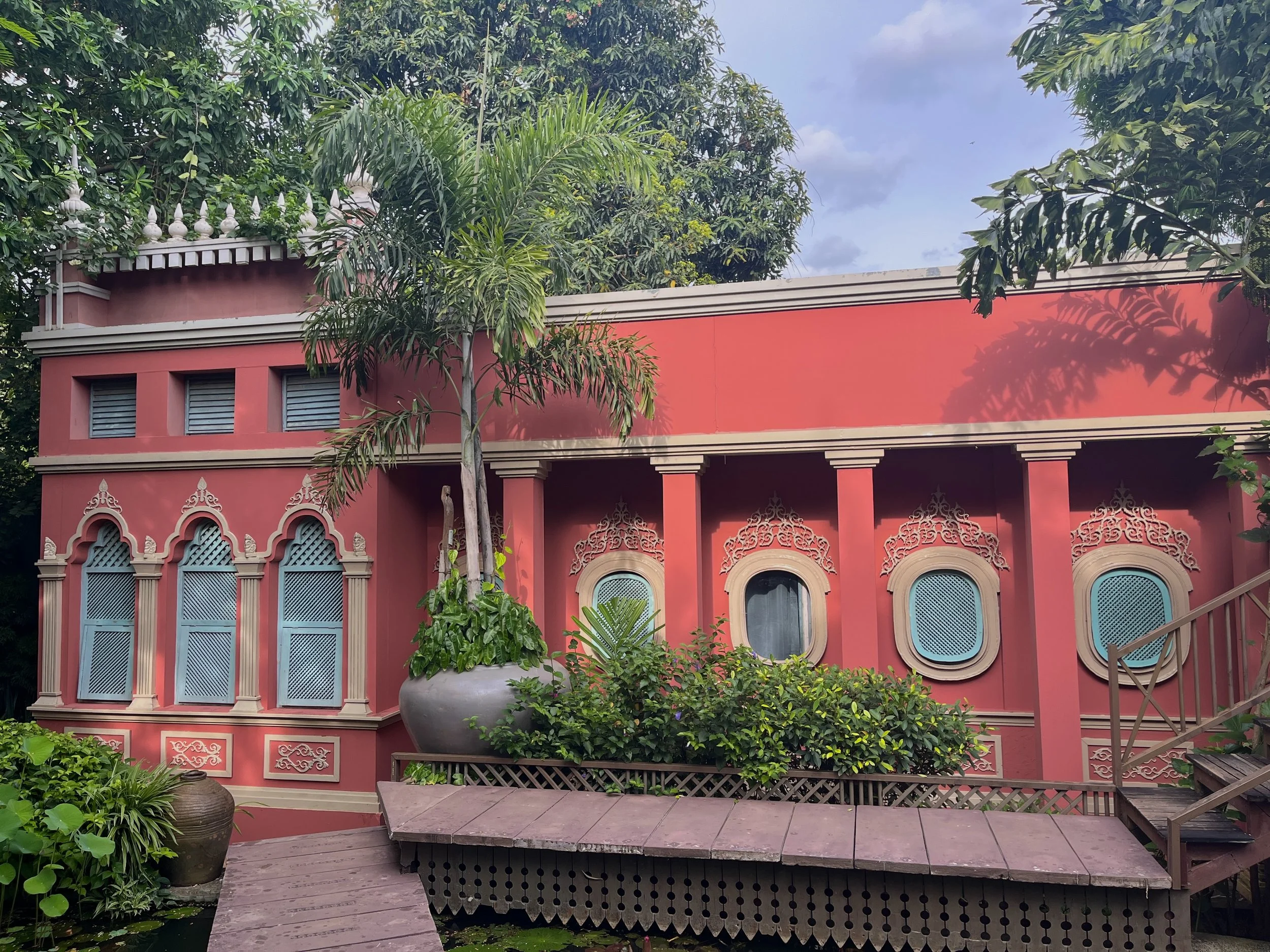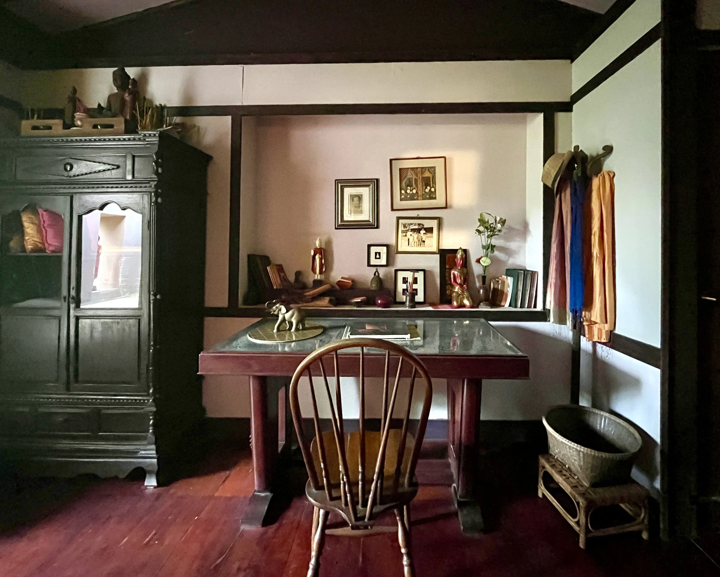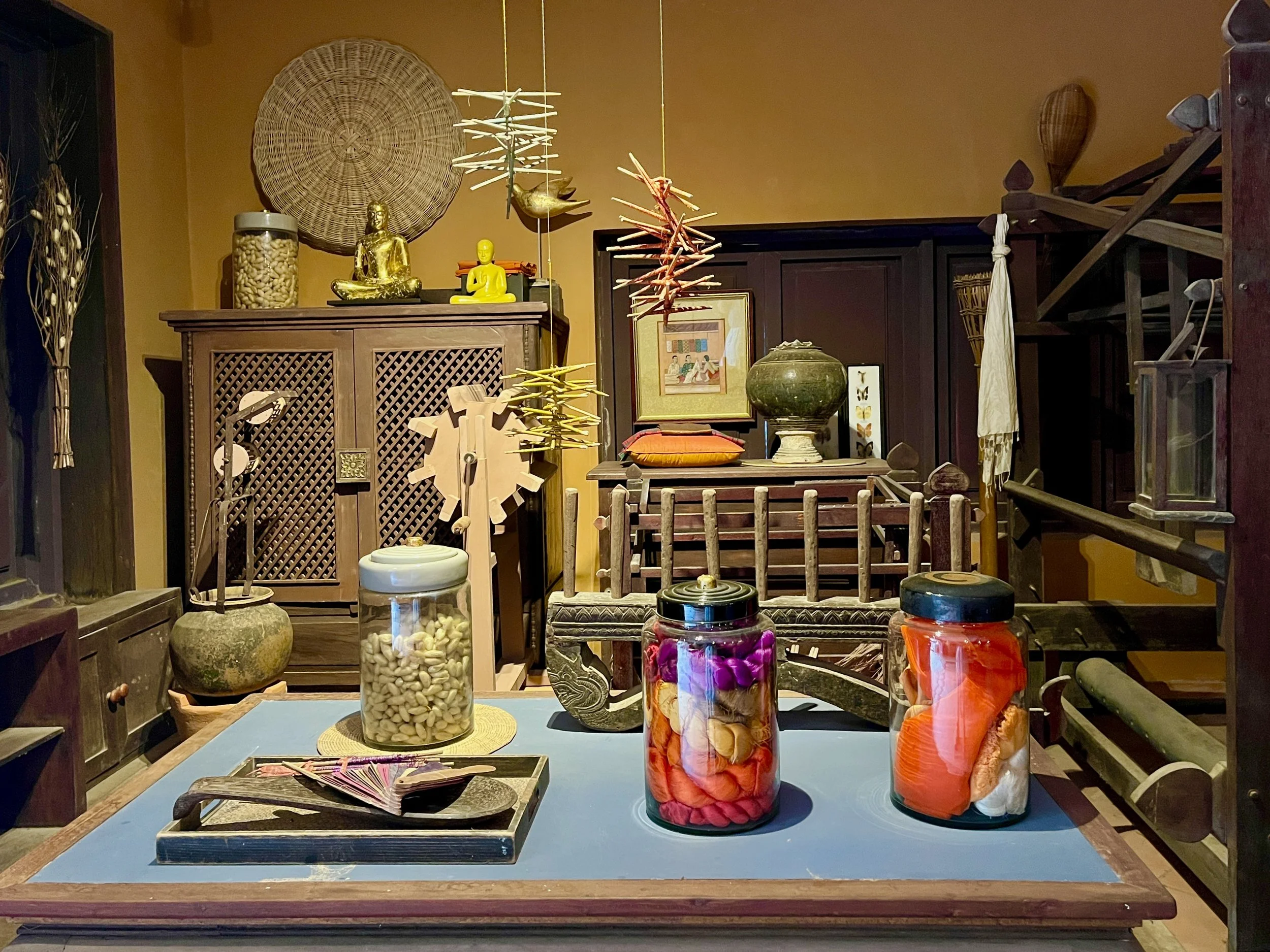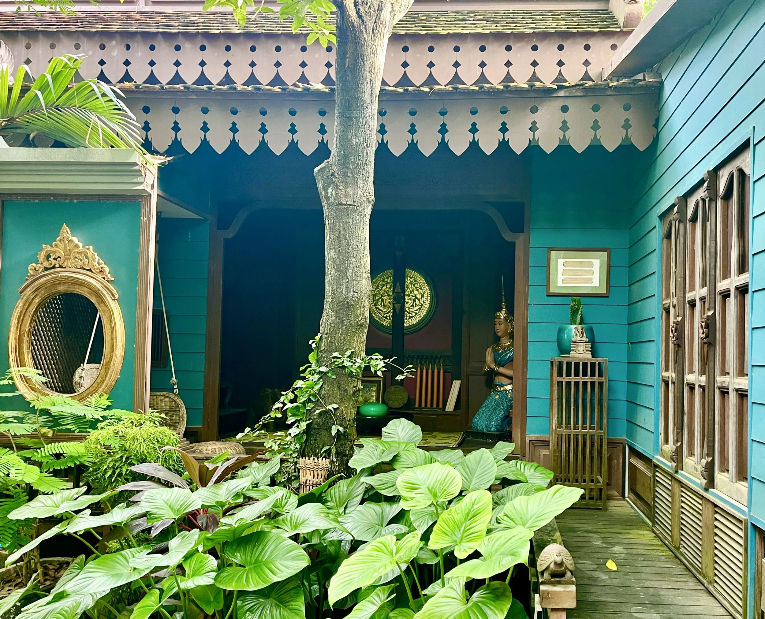 The place is a series of architectural and decorative arts vignettes, composed entirely of traditional crafts and motifs, studded with a few genuine antiques. The skill and taste level here is often mid, but occasionally striking, and rather more delightful when you understand and witness the place as a living document, an open workshop. Theam himself was on the premises when I visited, directing some roofing and repainting of a façade; he noticed me but did not introduce himself. In addition to the introduction to the language of Khmer aesthetics, the thing I appreciated most is his color sense- very different from mine, but I don’t dislike it. Dark chocolate woods and gemtone paints and fabrics figure heavily.