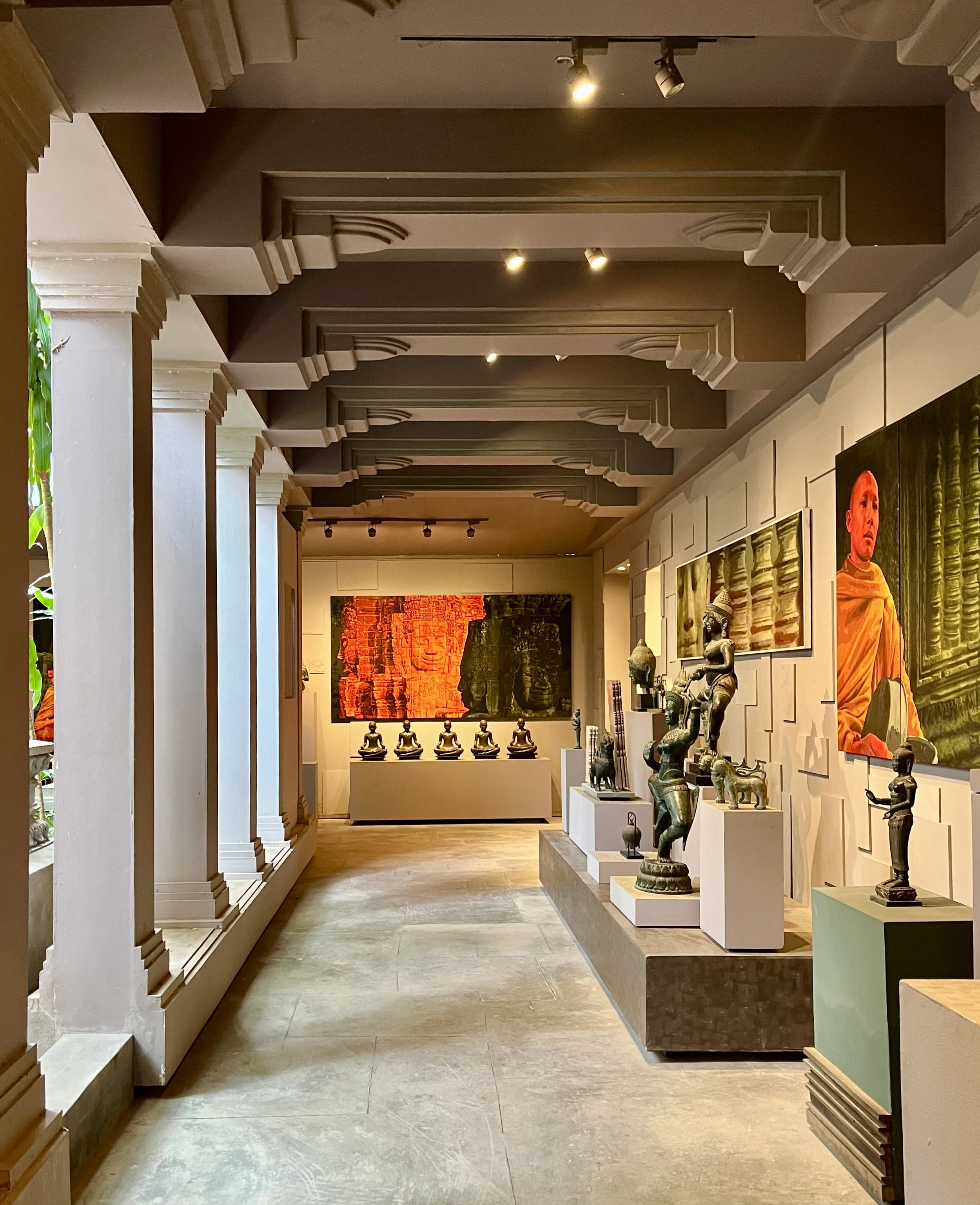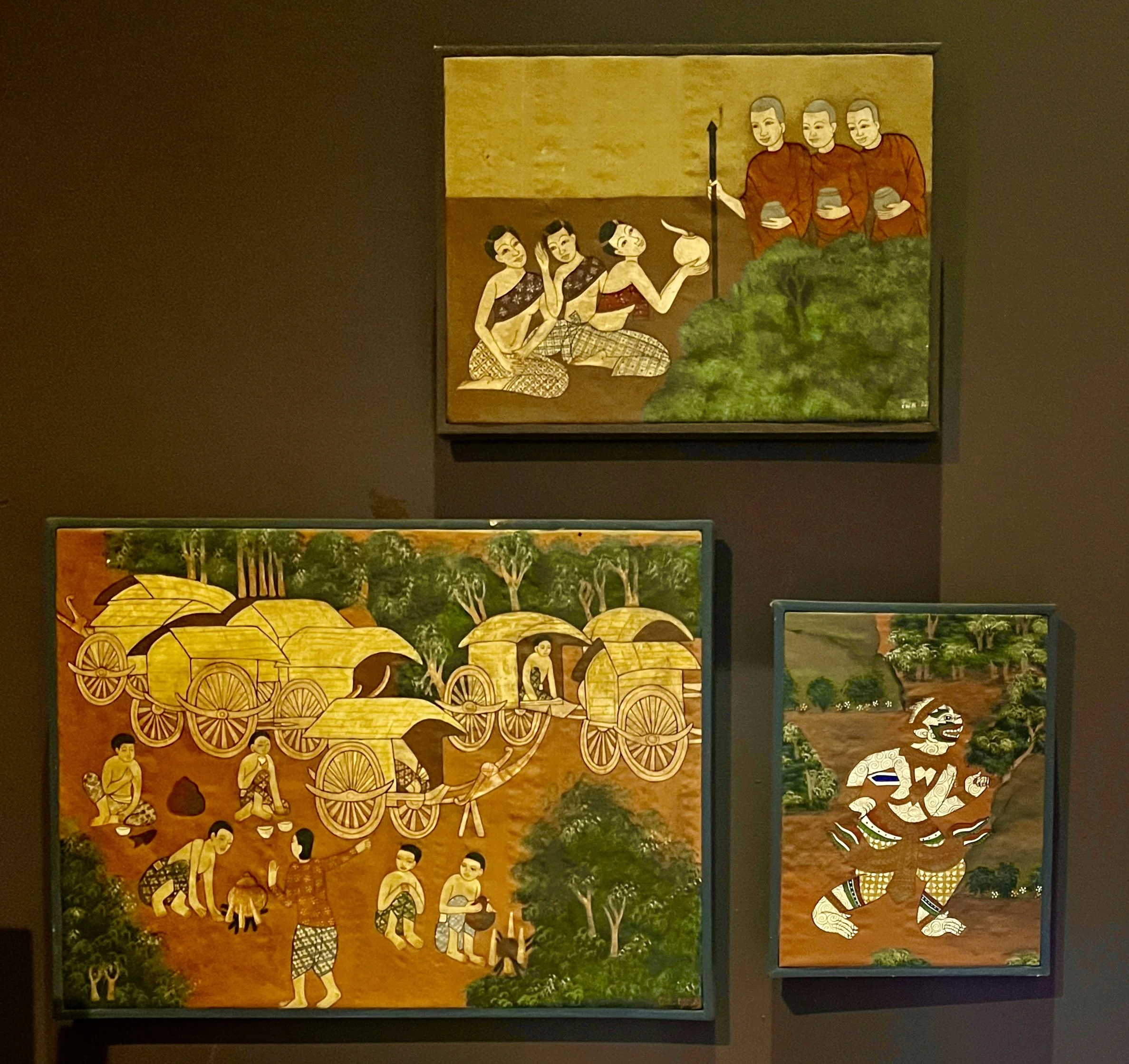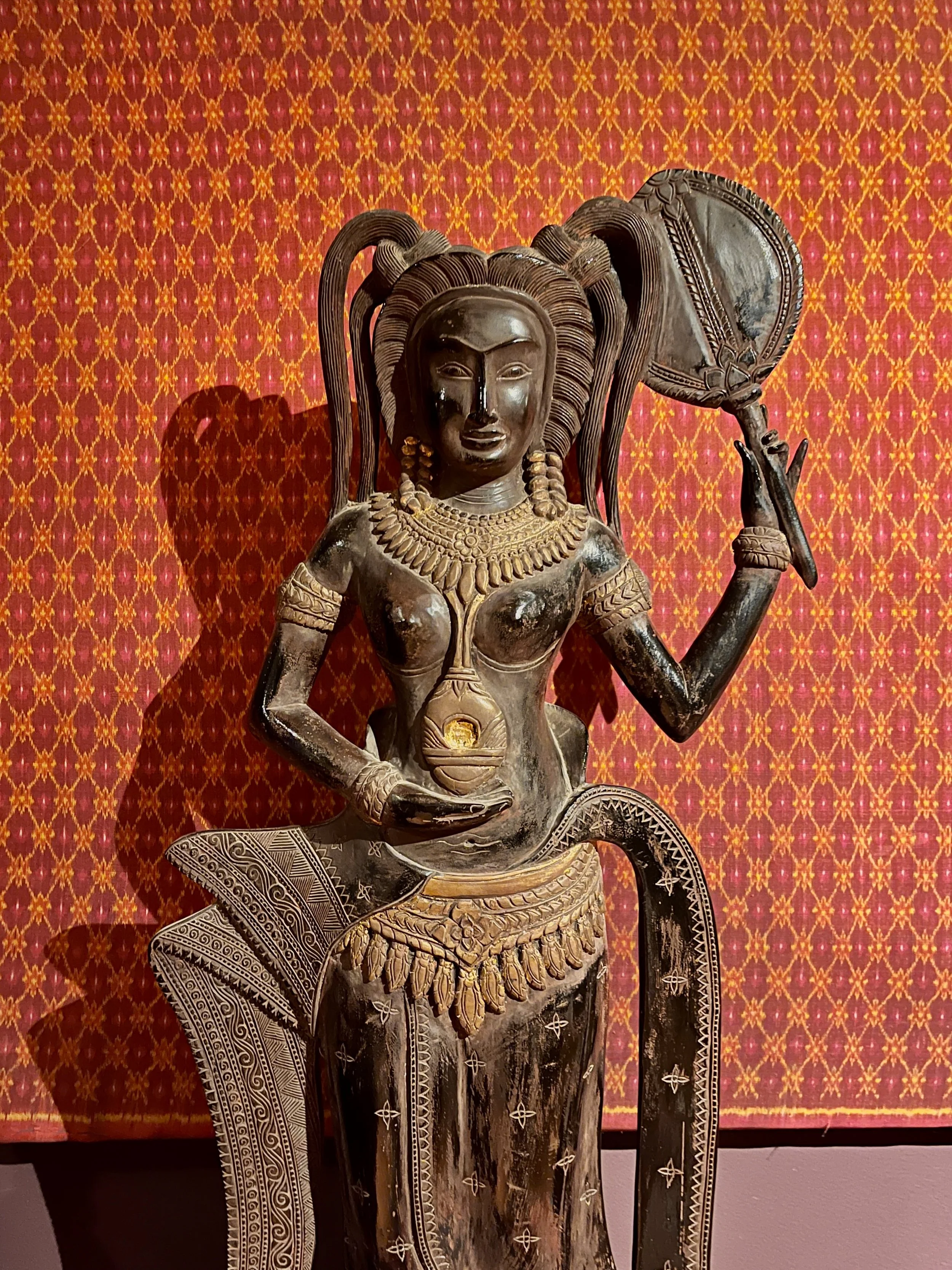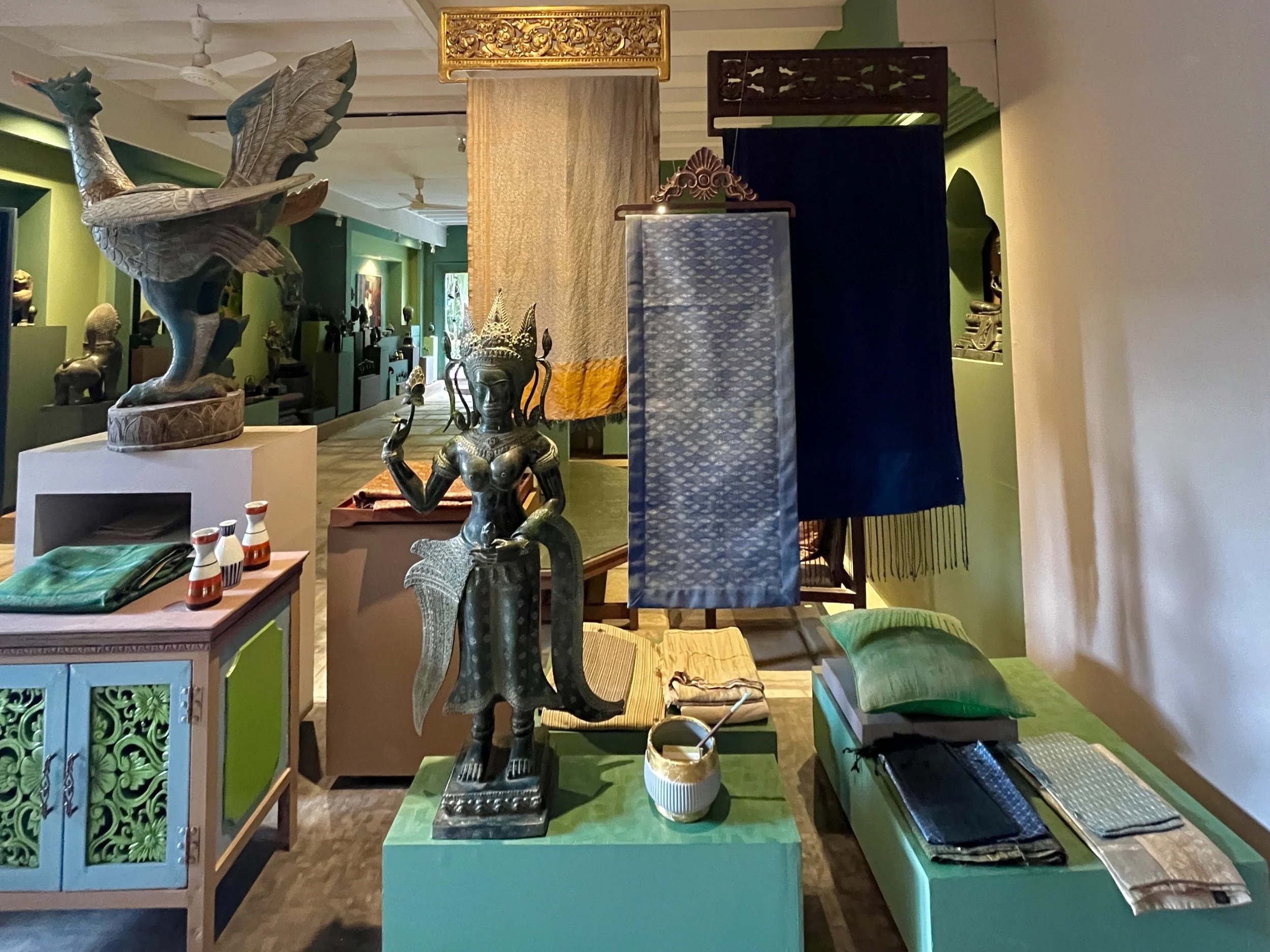 His declared mission is to revive traditional and innovative modes of Cambodian arts and crafts by training local artisans. Onsite there’s an extensive gift shop of his work, that of his protégés, and a collection of the best pieces from other local shops, including IKTT and Artisans d’Angkor . . . all gathering dust, as tourists to Siem Reap generally do not have the budget to spend on this sort of thing, and, even if they did, are more the hiker/backpacker type than the sort who bring home handwoven silk panels and lacquer triptychs, and, even if they were, they’d undoubtedly find the source before they found Theams. So, the admission fee is $5 USD, and I do think it’s worth it.