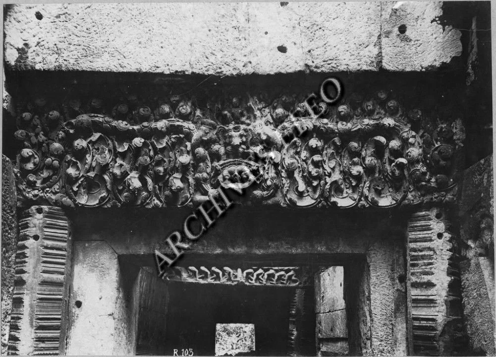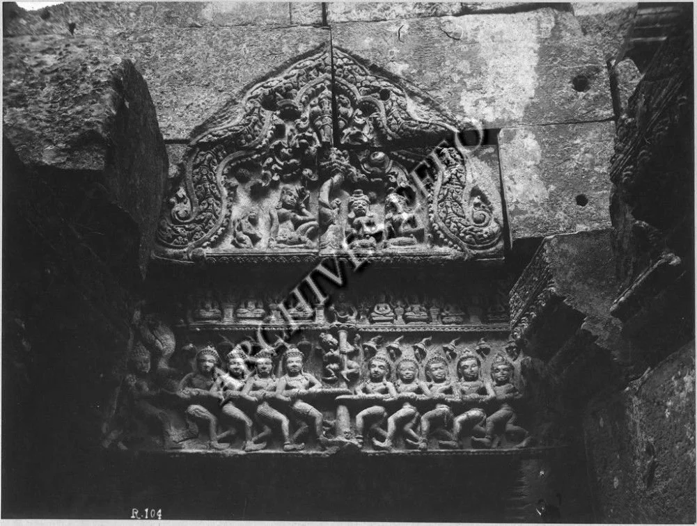 Surprisingly, given the clear cultural value of the carvings even as they remain today, just a few photos are available in the EFEO online photo library. Coming from an unidentified Cambodian fonds, and given the handpainted index numbers, I’m guessing they were taken in 1930 or possibly well before. Someone more familiar with the very first photographers of the region might be able to recognize the handwriting or lettering system. They don’t seem Gsell.